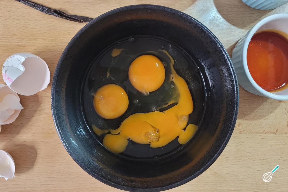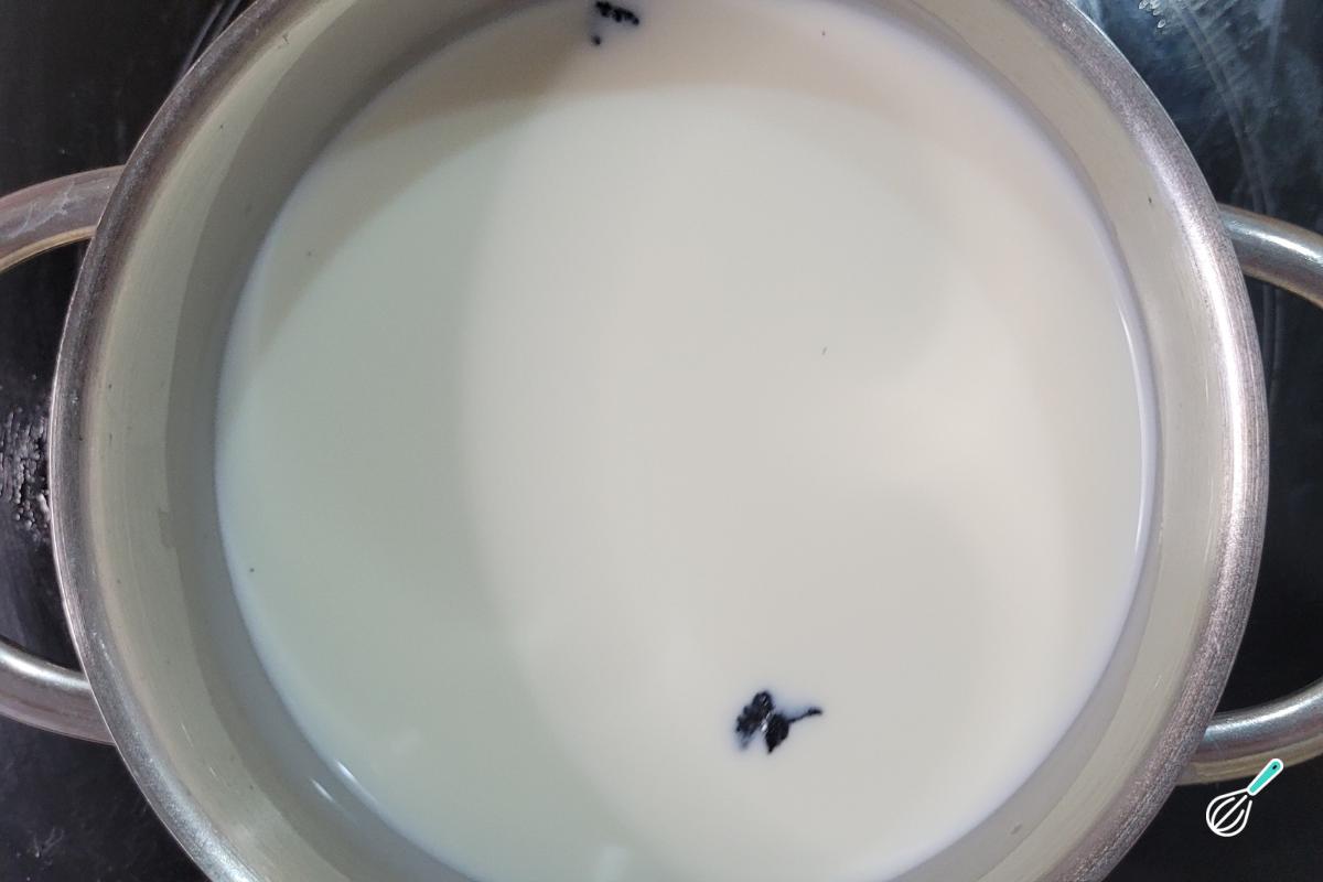 Reserve e enquanto isso leve o leite para esquentar em uma panela com as sementes da fava de baunilha, sem deixar ferver.