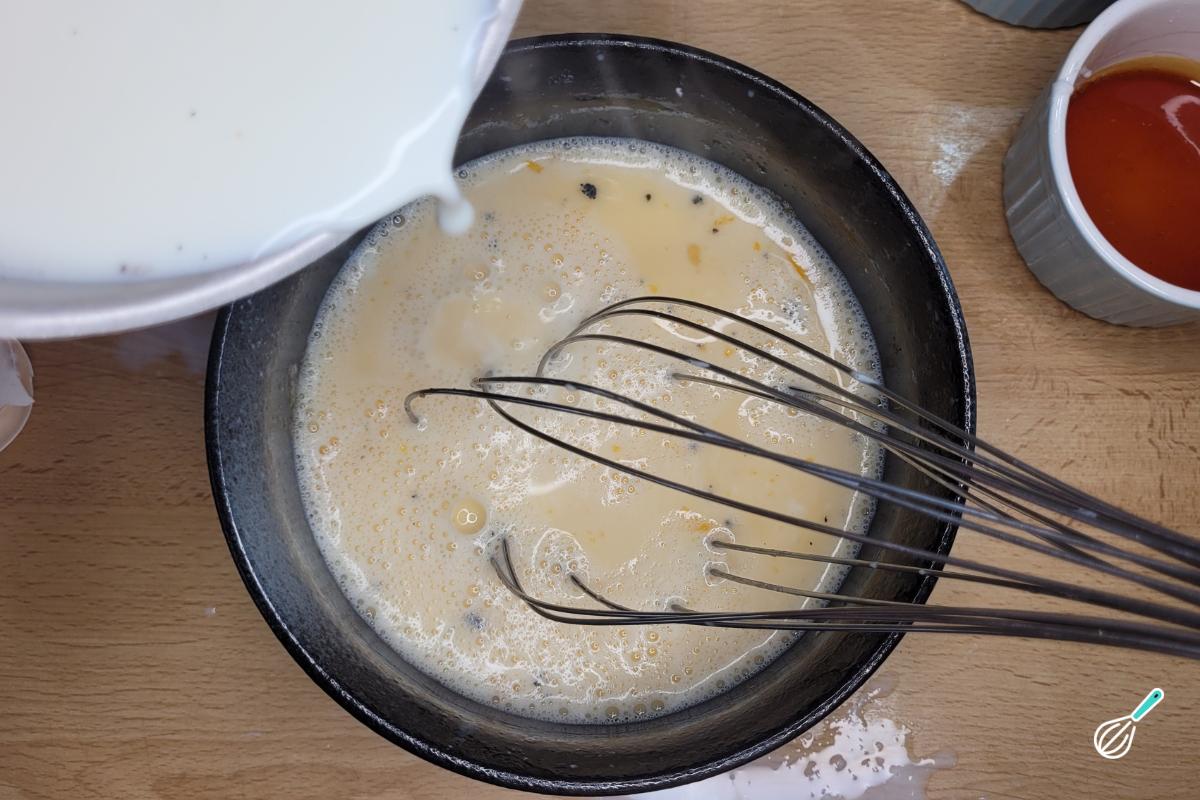 Coloque o leite quente aos poucos, sempre mexendo para incorporar e para igualar a temperatura sem coagular os ovos.