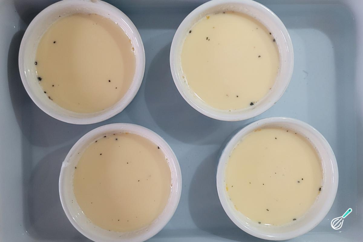 Verta o creme sobre as forminhas com o caramelo no fundo. Disponha as forminhas em uma assadeira maior com borda mais alta. Cubra com água fervendo até atingir mais ou menos metade da altura das forminhas para que assem em banho maria.