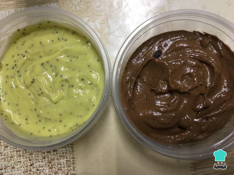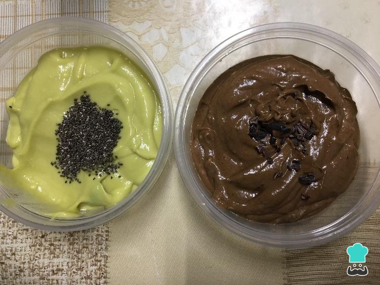 O passo seguinte desta receita de sobremesa de abacate é separar o creme de abacate em duas partes iguais. Em uma acrescente a chia e na outra o cacau e os nibs de cacau.