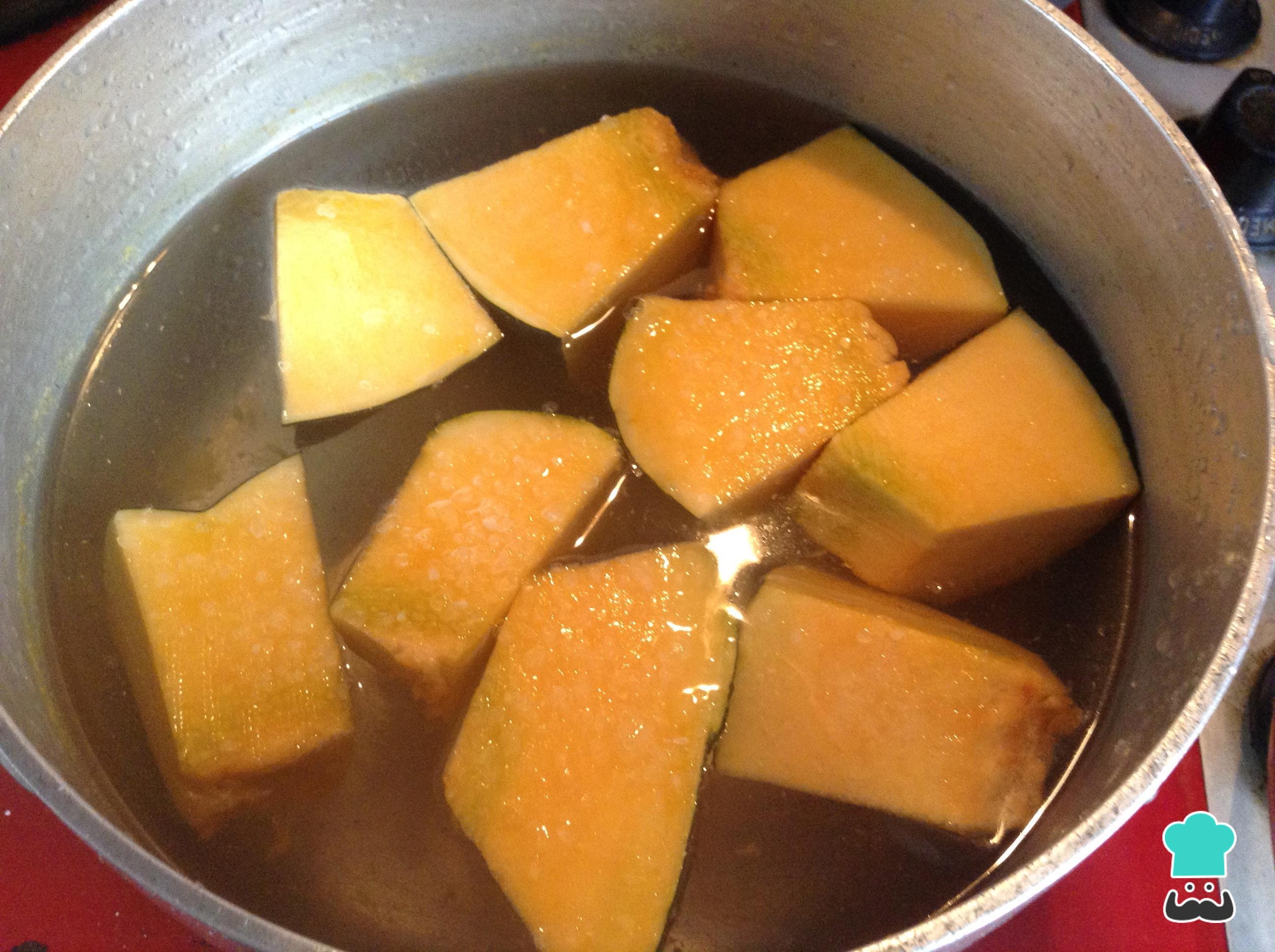 Corte a abóbora em cubos médios e leve a cozinhar em uma panela com água e sal, em fogo médio, até que esteja macia.