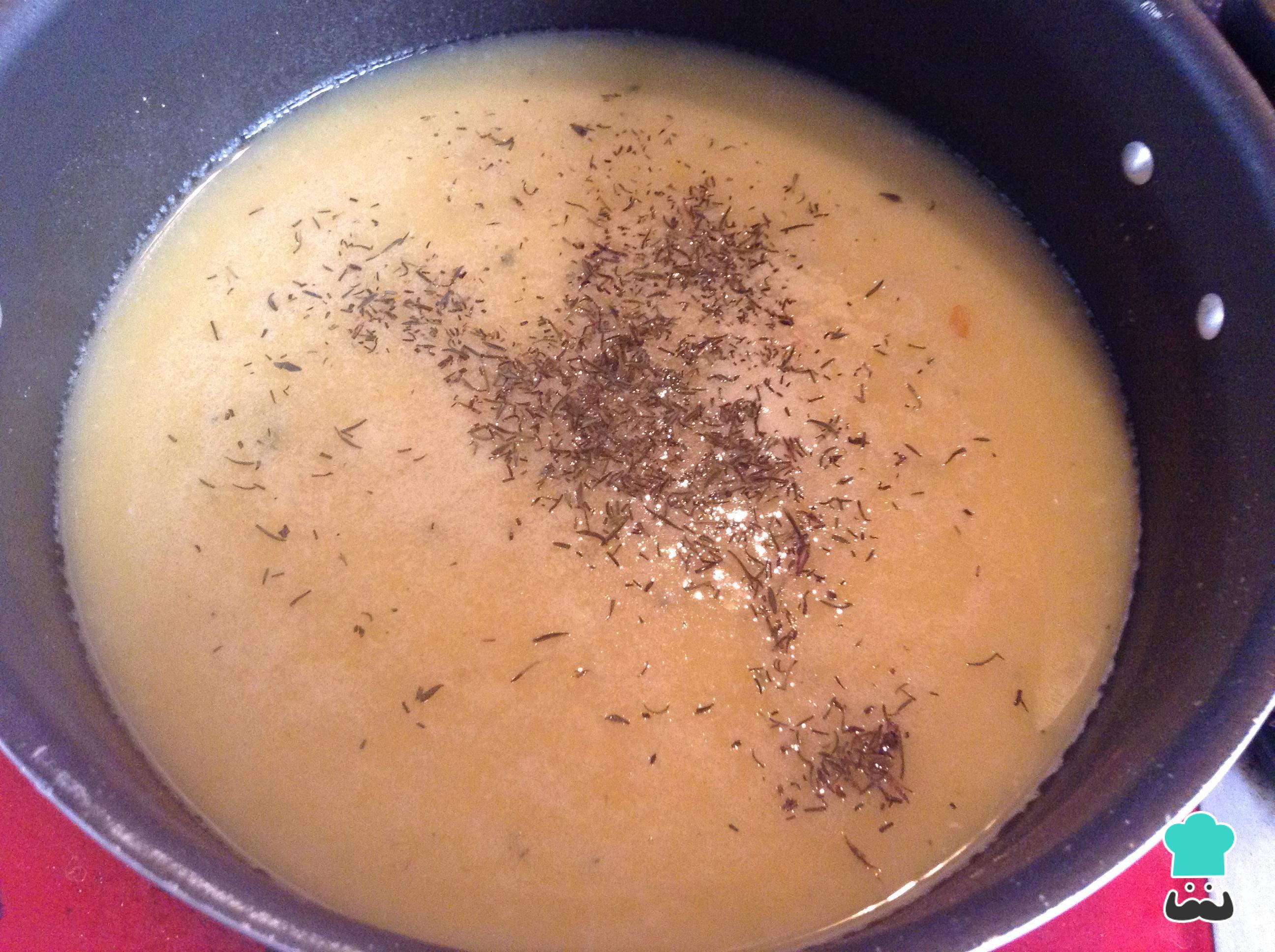 Leve ao fogo médio uma panela com a mistura anterior, o creme de leite, o molho branco e um pouco de tomilho. Cozinhe em fogo baixo durante 10 minutos e desligue.