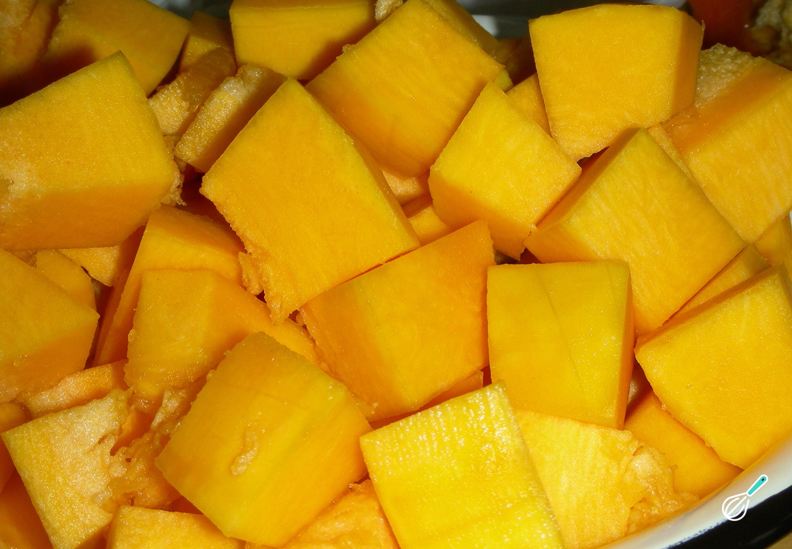 O primeiro passo desta receita é descascar a abóbora e cortar em pedaços. Cozinhe em uma panela com água e sal até que fique macia, escorra e reserve.