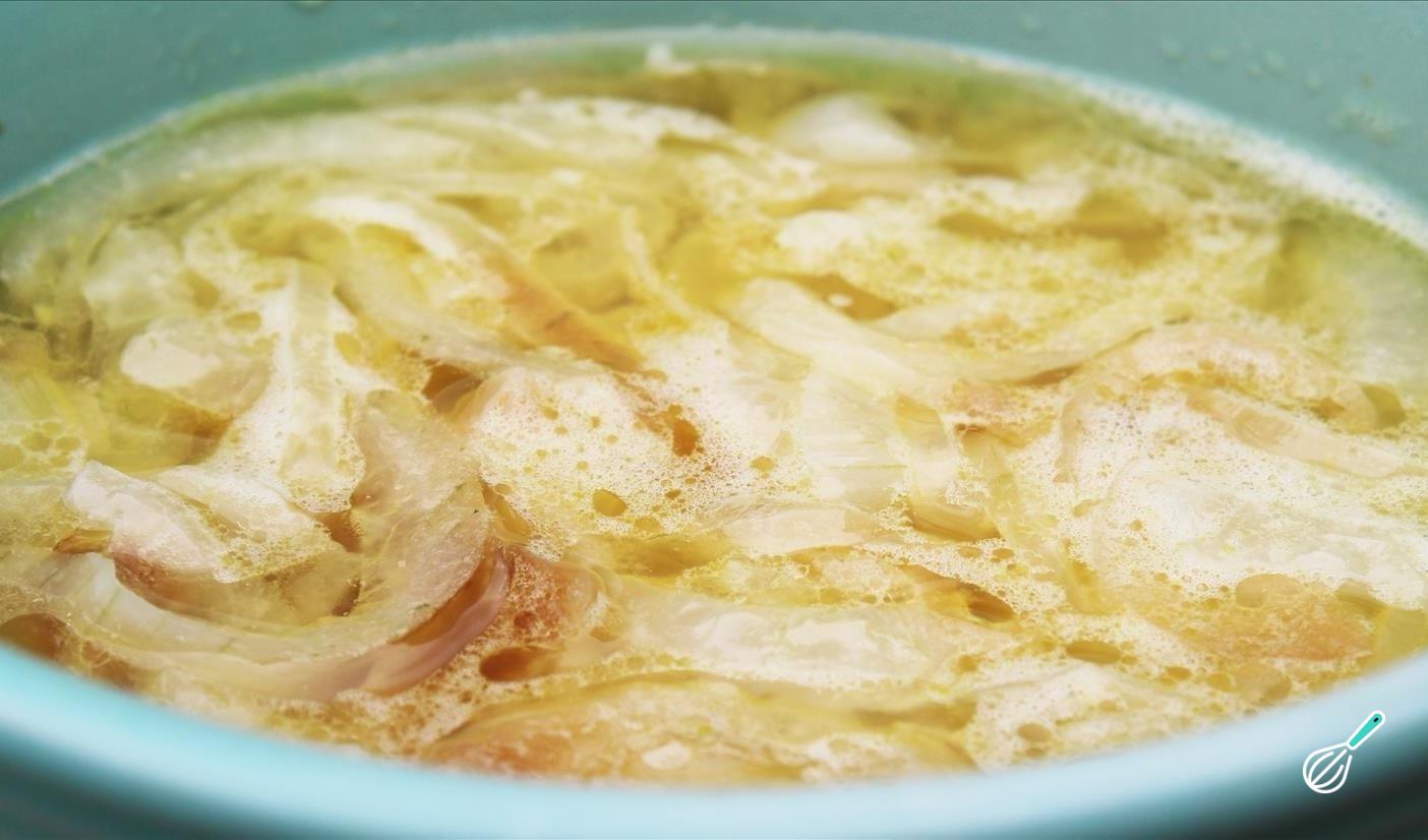 Acrescente o caldo de carne à panela com a cebola e o alho-poró e deixe levantar fervura. Depois baixe o fogo e cozinhe por mais 3 minutos, para concentrar os sabores. Desligue e deixe esfriar um pouco.