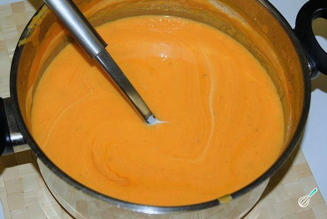 Bata o preparado anterior com a abóbora escorrida até obter um creme sem pedaços. Leve de novo ao fogo e, depois de ferver, cozinhe por mais 3 minutos. Acerte o sabor com sal e pimenta a gosto.
