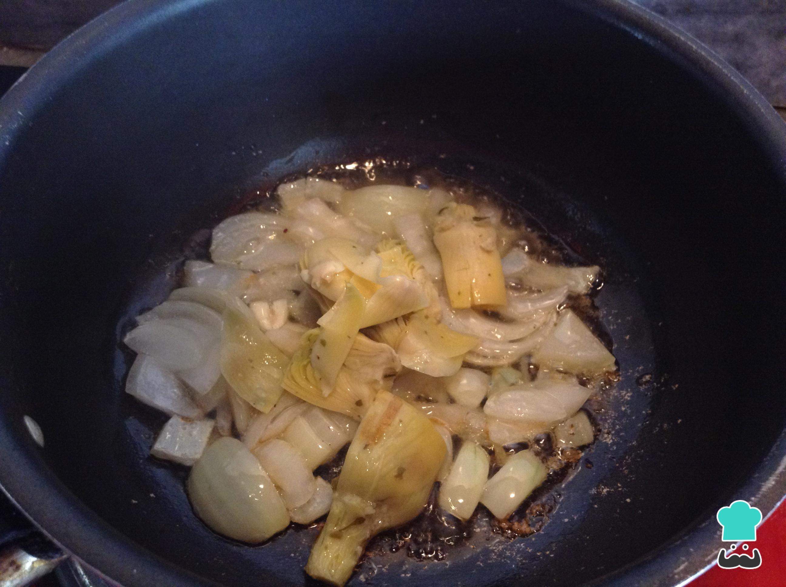 Quando a cebola estiver transparente, adicione os corações de alcachofra e tempere com sal e pimenta. Cozinhe durante 5-10 minutos.