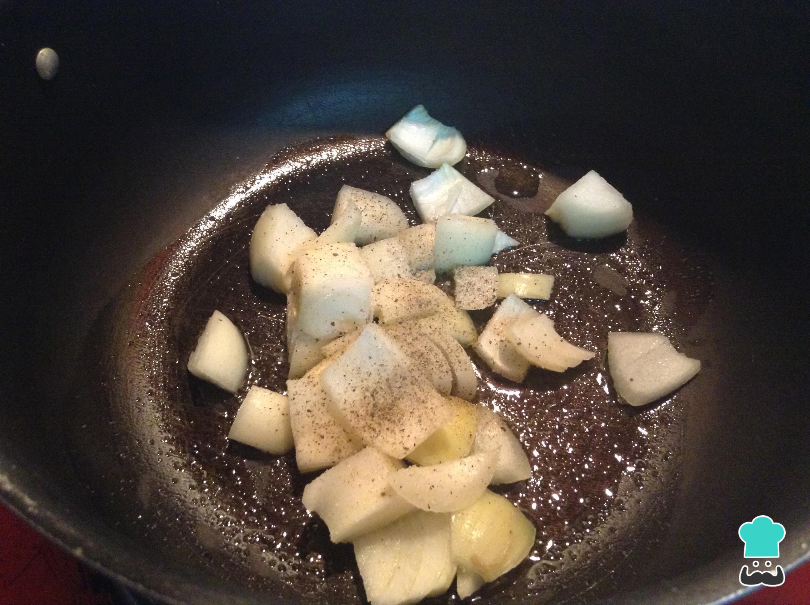 Leve uma panela ao fogo médio, adicione o azeite e, quando estiver quente, acrescentea cebola branca cortada em cubos, como na imagem.