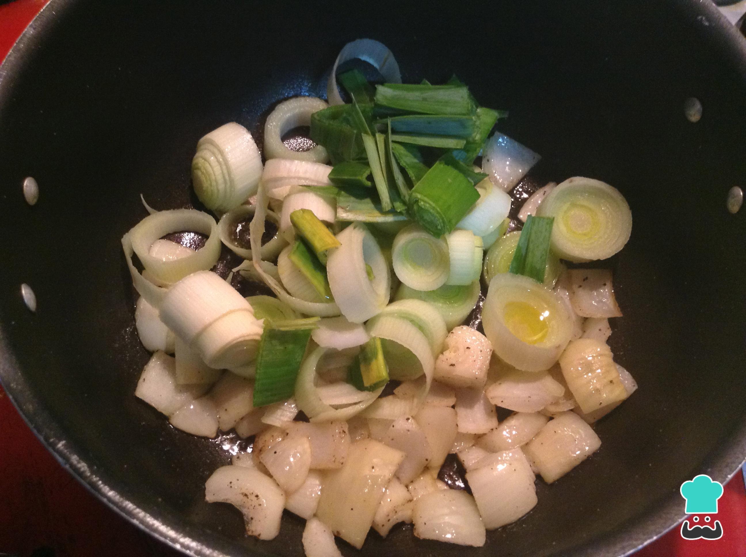 Quando você notar que a cebola está transparente, o passo seguinte do creme de alho-poró light é adicionar o alho-poró fatiado com um pouco da parte verde. Tempere com sal, pasta de alho e pimenta a gosto, misture e cozinhe por 1-2 minutos.