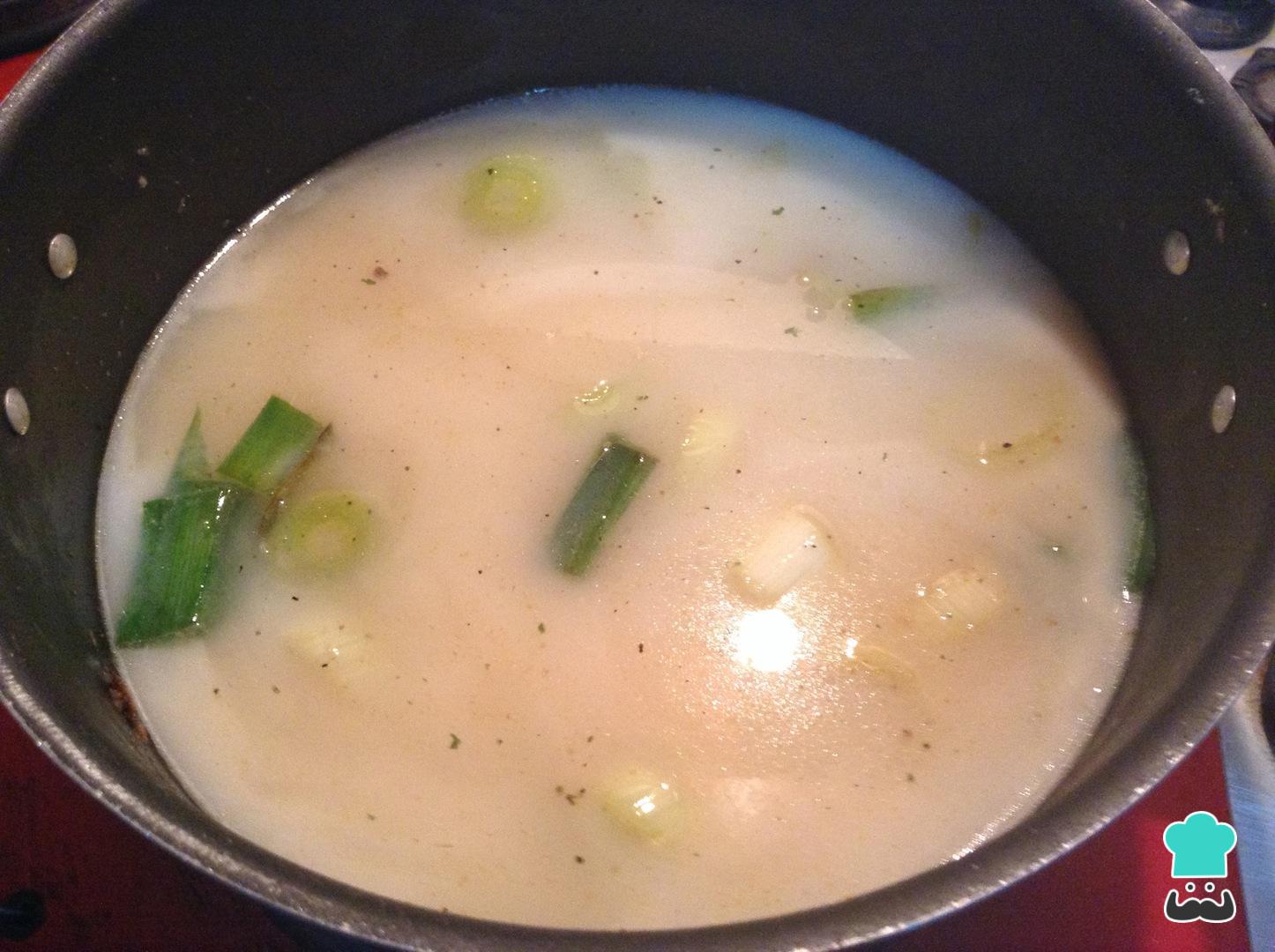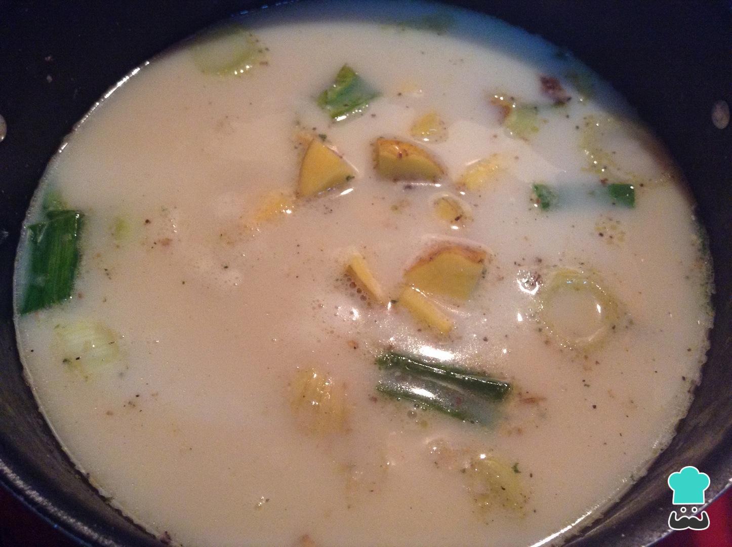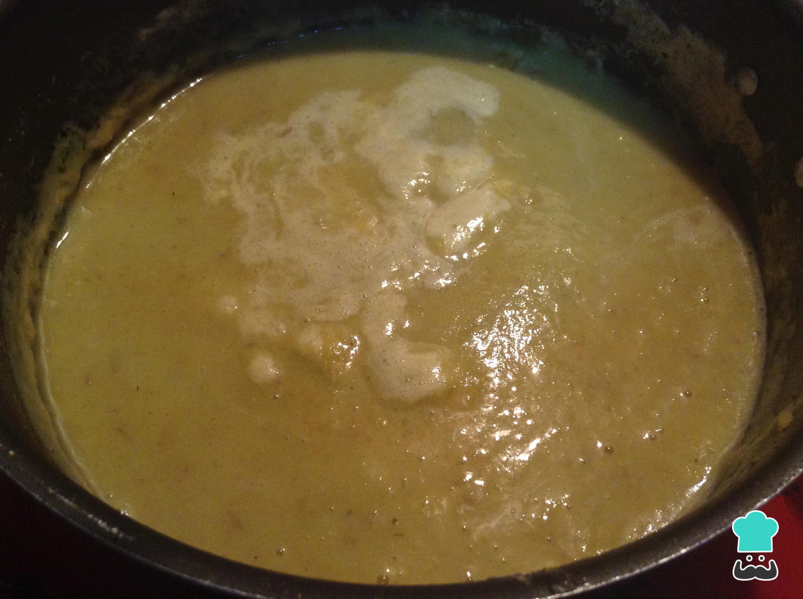 Adicione a batata cortada em cubos pequenos, para tornar este creme espesso, e cozinhe por 15-20 minutos, ou até as batatas ficarem macias. Desligue o fogo e deixe esfriar um pouco.