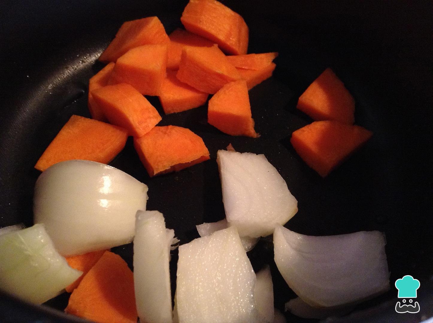 Leve ao fogo médio uma panela o azeite ou óleo, e refogue a cebola e a cenoura cortadas em pedaços, por 1-2 minutos.