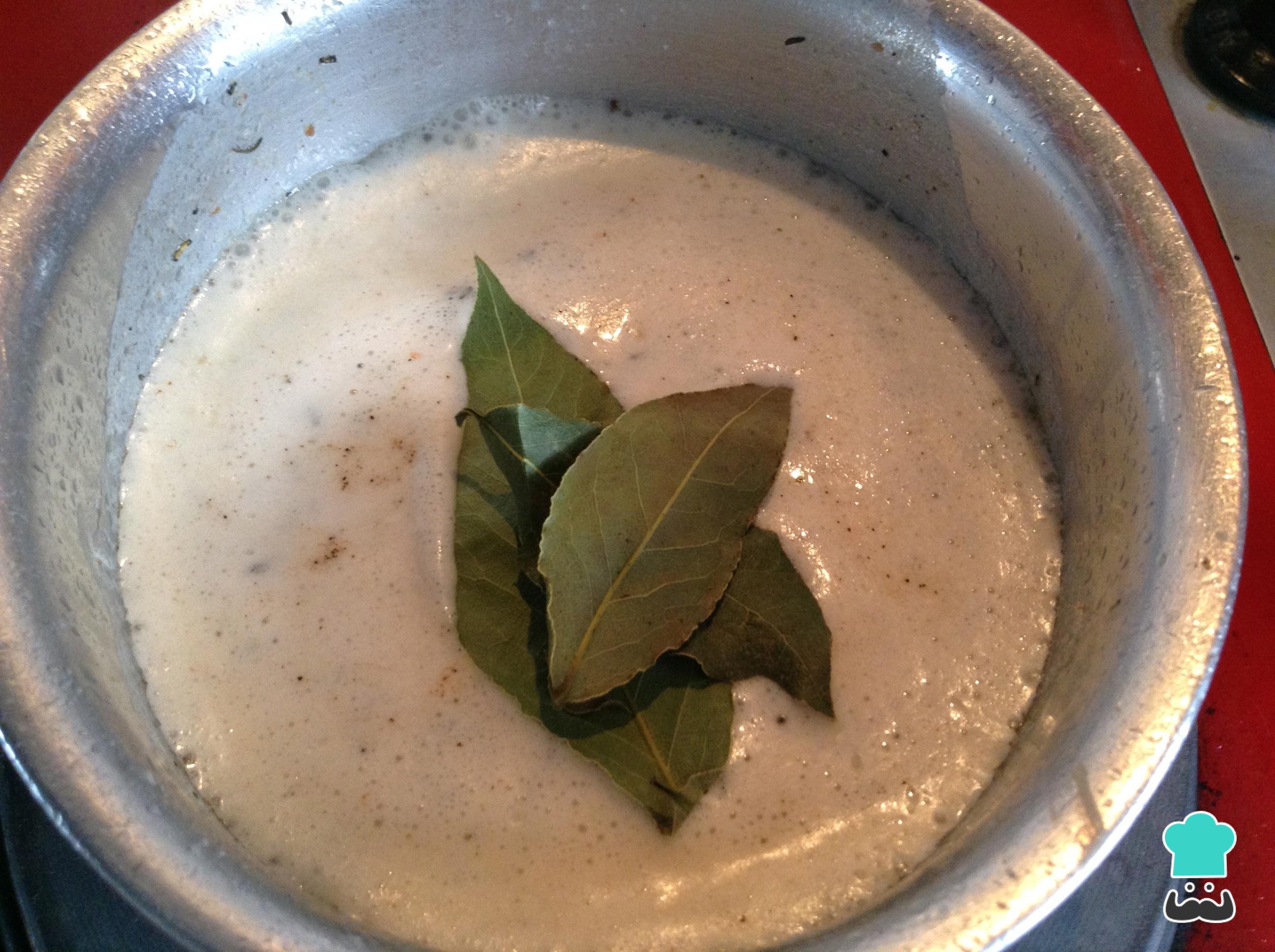 Adicione o leite e folhas de louro à panela e cozinhe em fogo baixo durante 10 minutos, aproximadamente. Adicione os aspargos cortados.