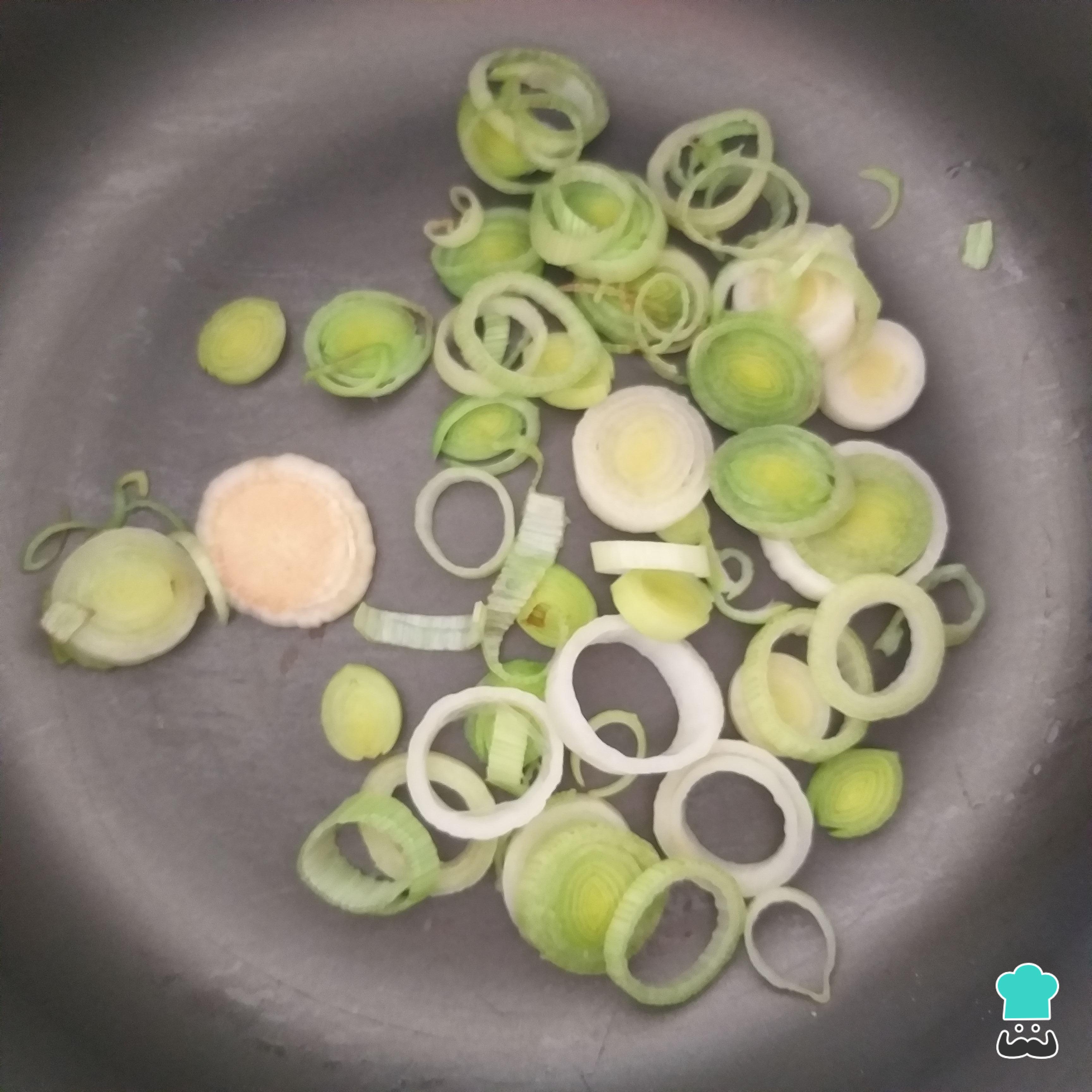 Para começar a sua receita de creme de batata baroa, coloque o alho poró e o óleo em uma panela em fogo médio. Mexa por alguns minutos até refogar.