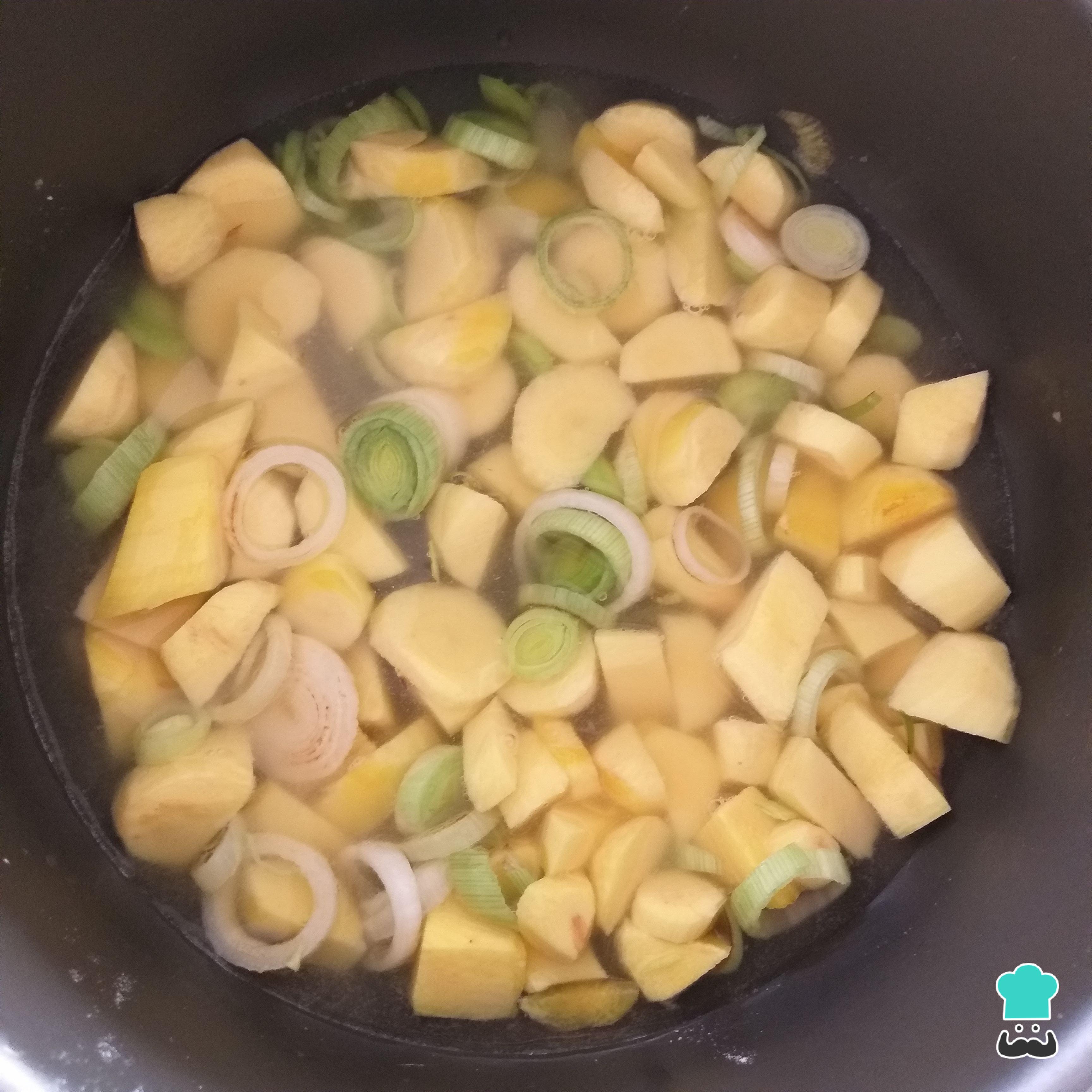 Acrescente as batatas, a água e o sal. Cozinhe até que os legumes do seu creme de batata baroa estejam macios.