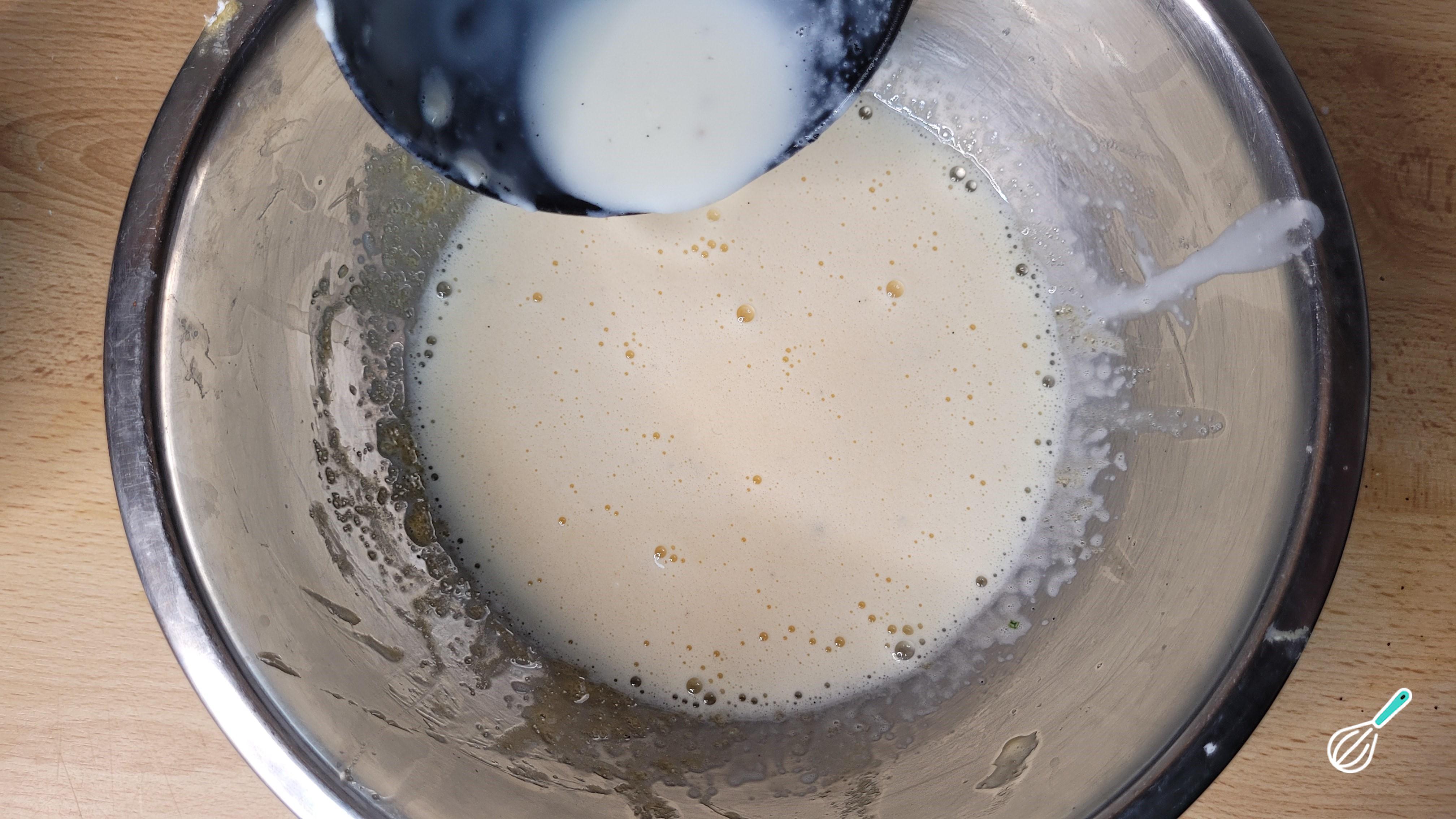 Quando a mistura de leite começar a levantar fervura e estiver com pequenas bolhas, despeje aos poucos e mexendo bem na mistura de ovos com leite. Esse processo se chama de temperagem e é feito para que os ovos cheguem na temperatura do leite aos poucos, sem correr o risco de coagularem.