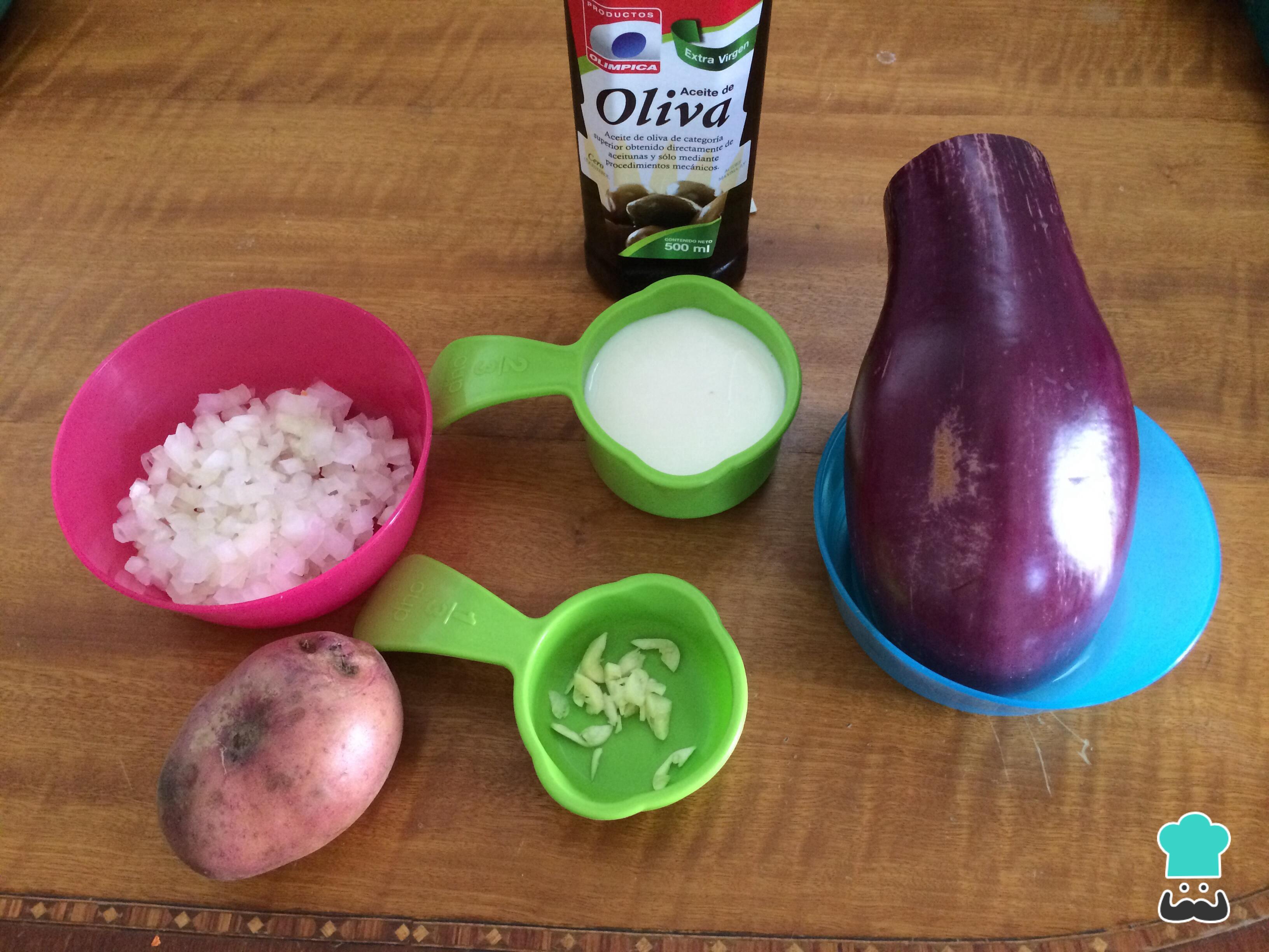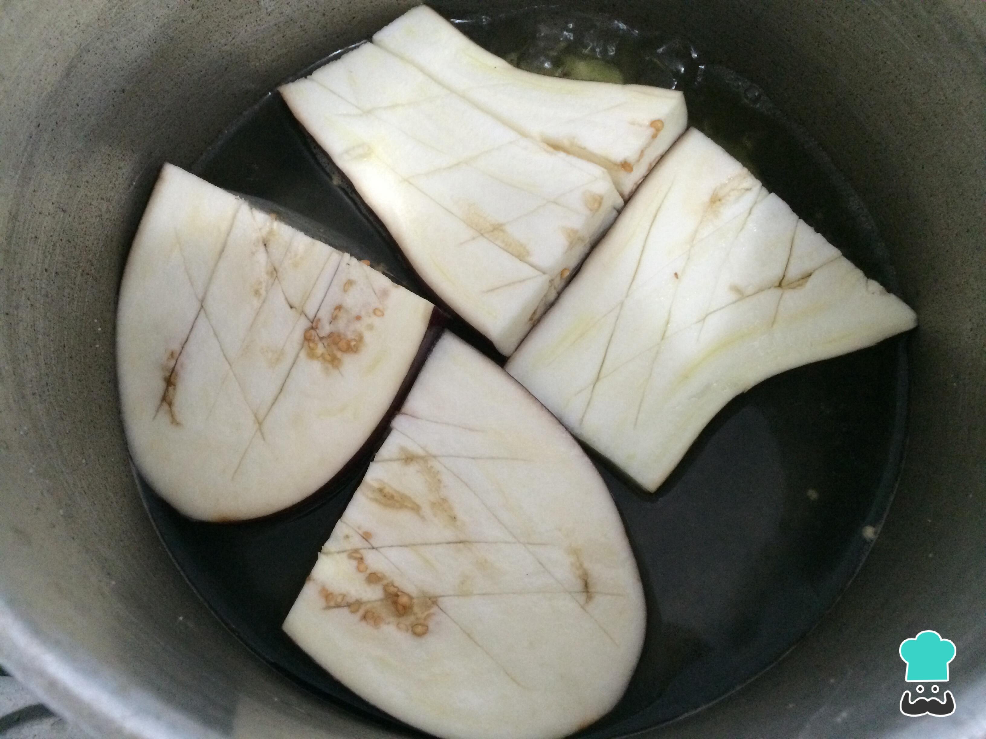 Em uma panela com água fervente e sal, cozinhe berinjela cortadas em pedaços durante 20 minutos, até que esteja macia. Repita o mesmo procedimento com a batata descascada, numa panela à parte.