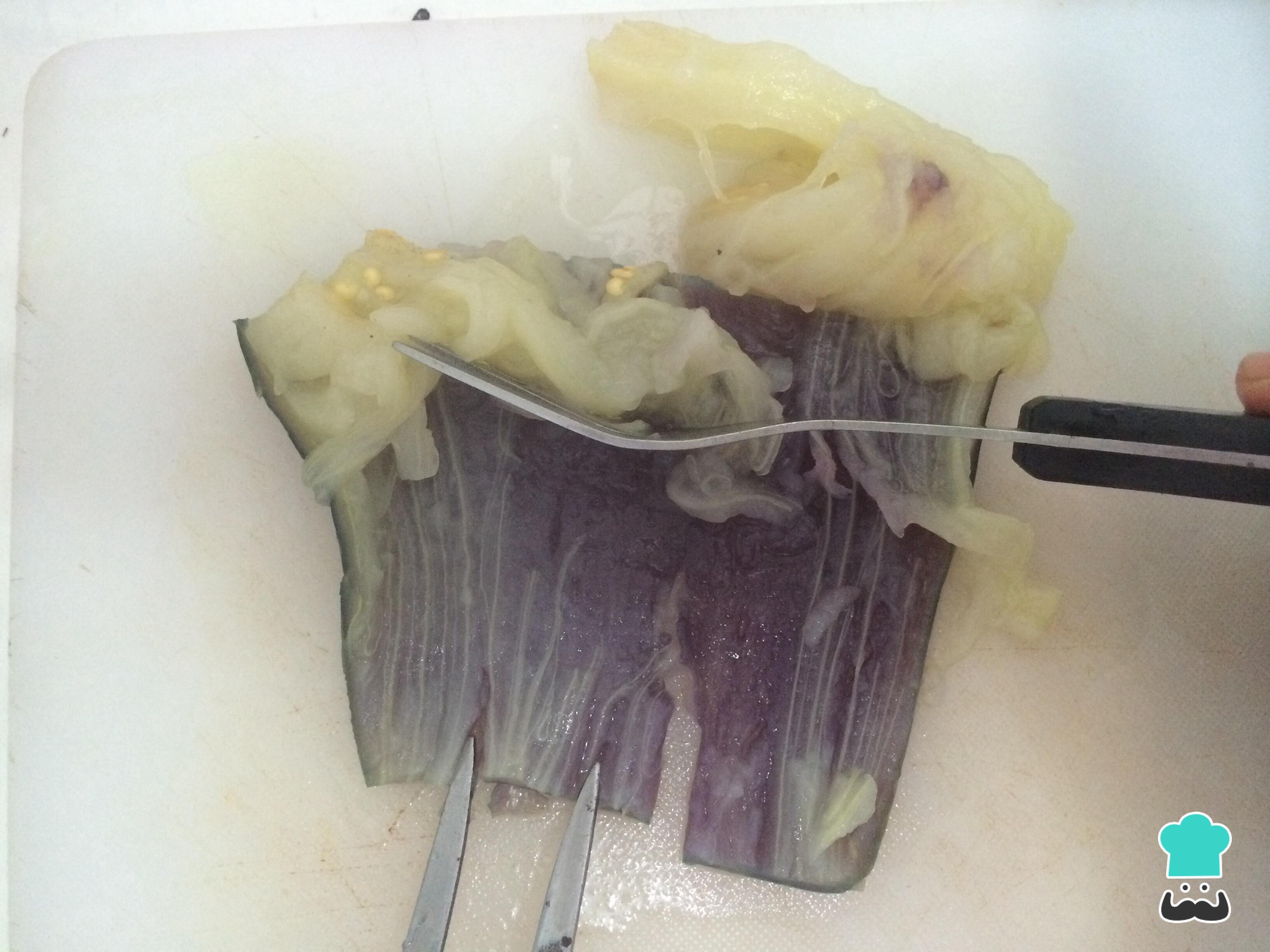 O passo seguinte desta receita de creme de berinjela é, com a ajuda de garfos, separar a polpa da pele da berinjela. Reserve somente a polpa.