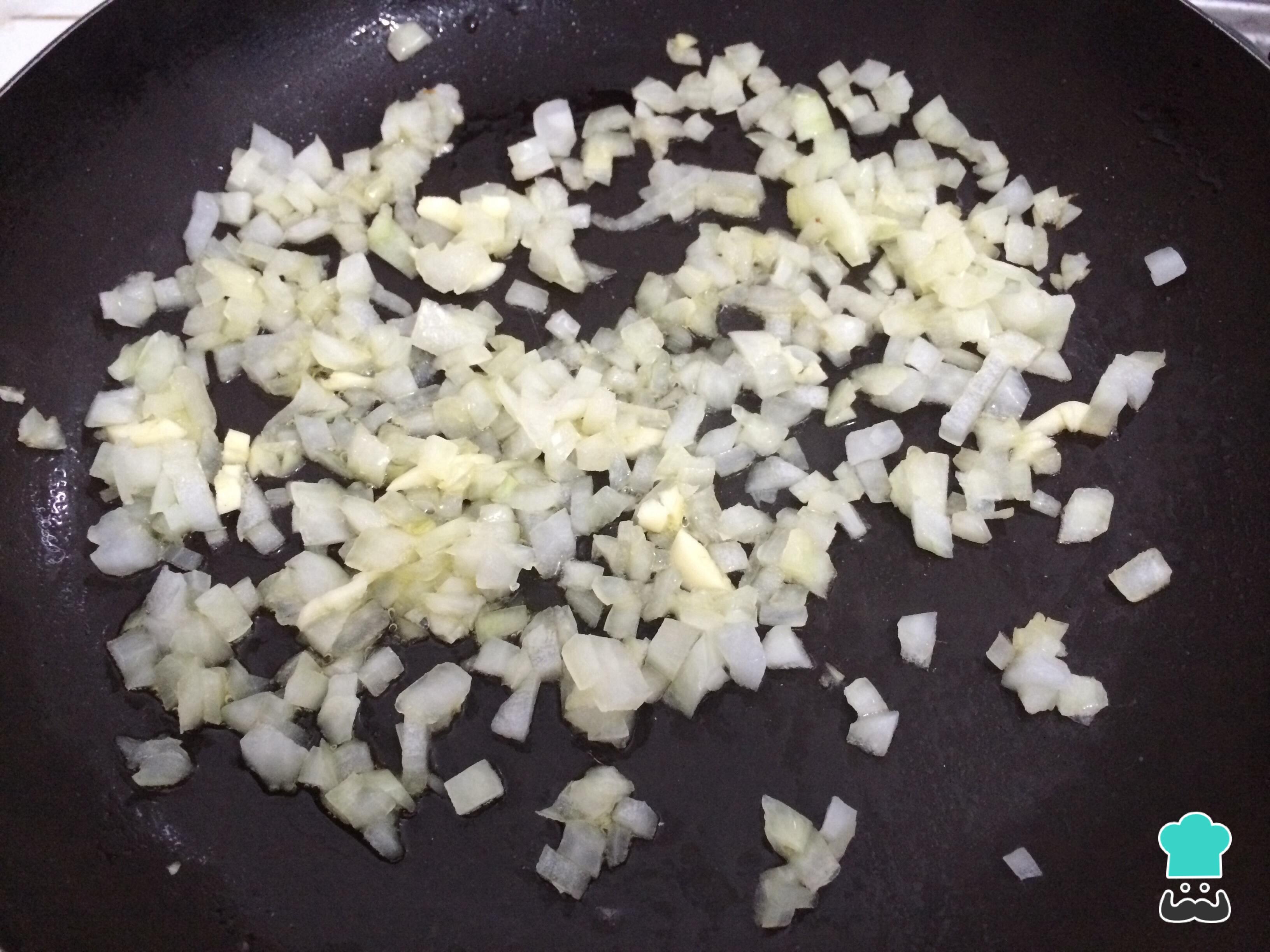 Em uma frigideira com azeite de oliva, cozinhe a cebola e o alho finamente picados por alguns minutos, ou até que a cebola esteja macia. Adicione sal e pimenta.