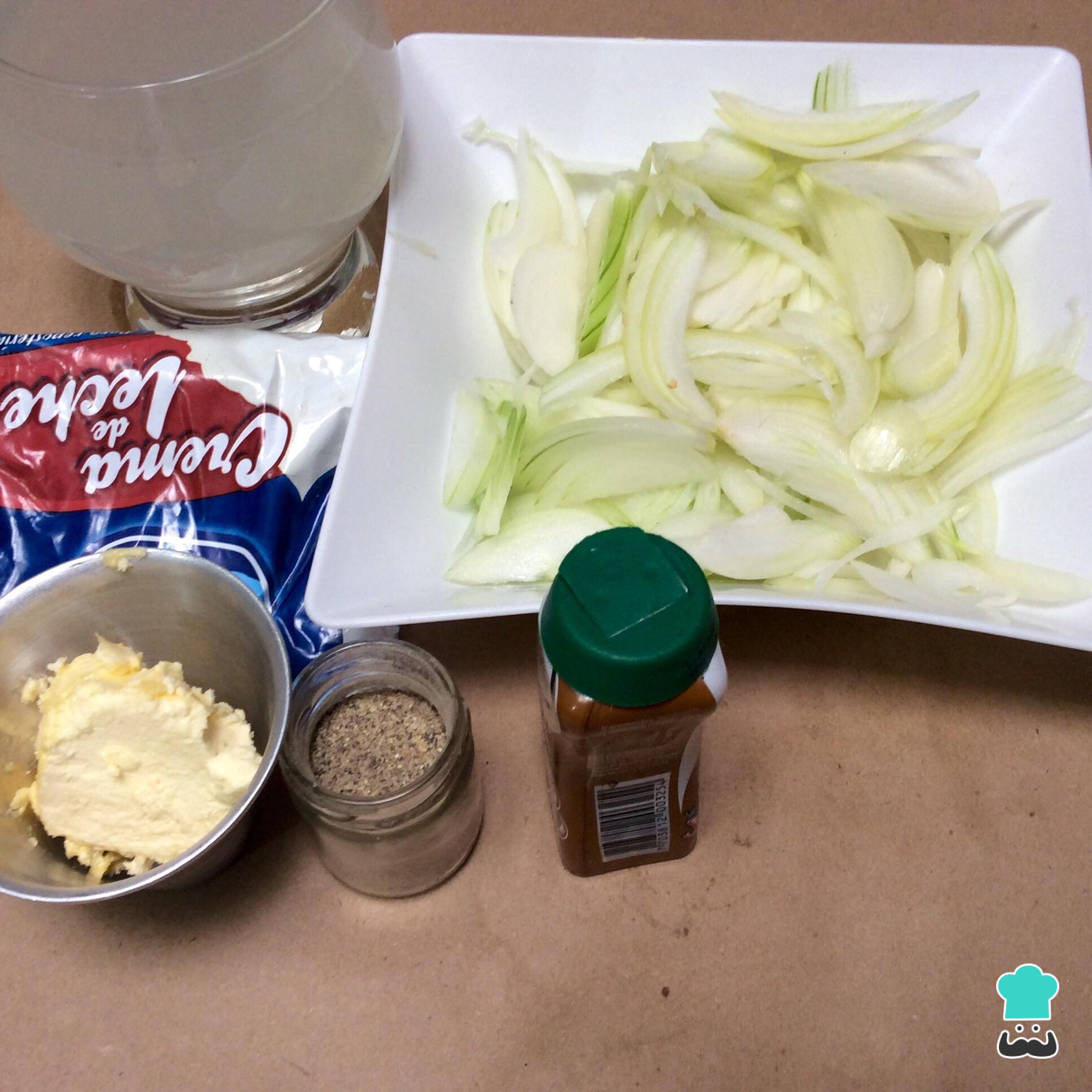 Para fazer esta receita de creme de cebola caramelizada comece por reunir todos os ingredientes.