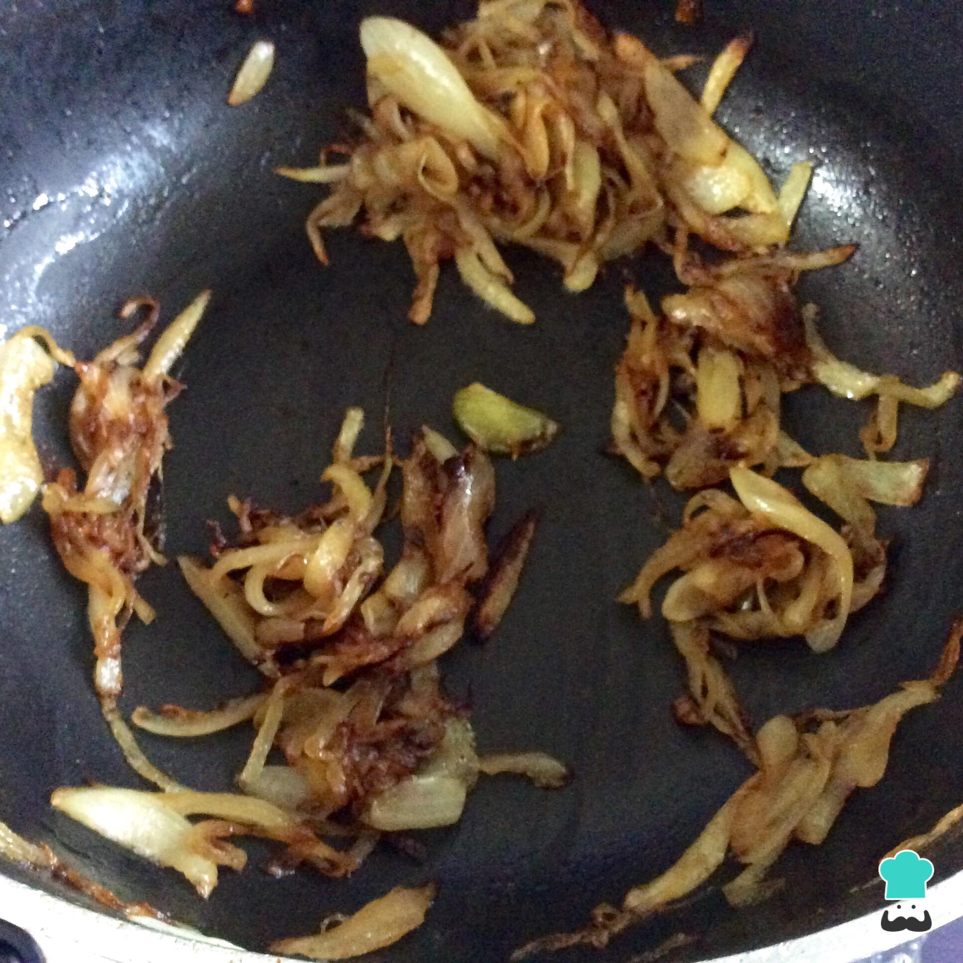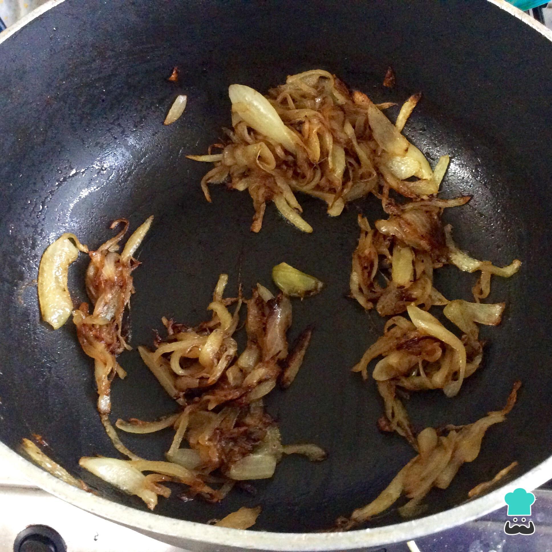 À medida que a cebola cozinha será possível observar que liberta o açúcar que contém e começa a caramelizar. O ideal é que a cebola fique dourada e não queimada, se quiser pode adicionar um pouco de açúcar para acelerar o processo.