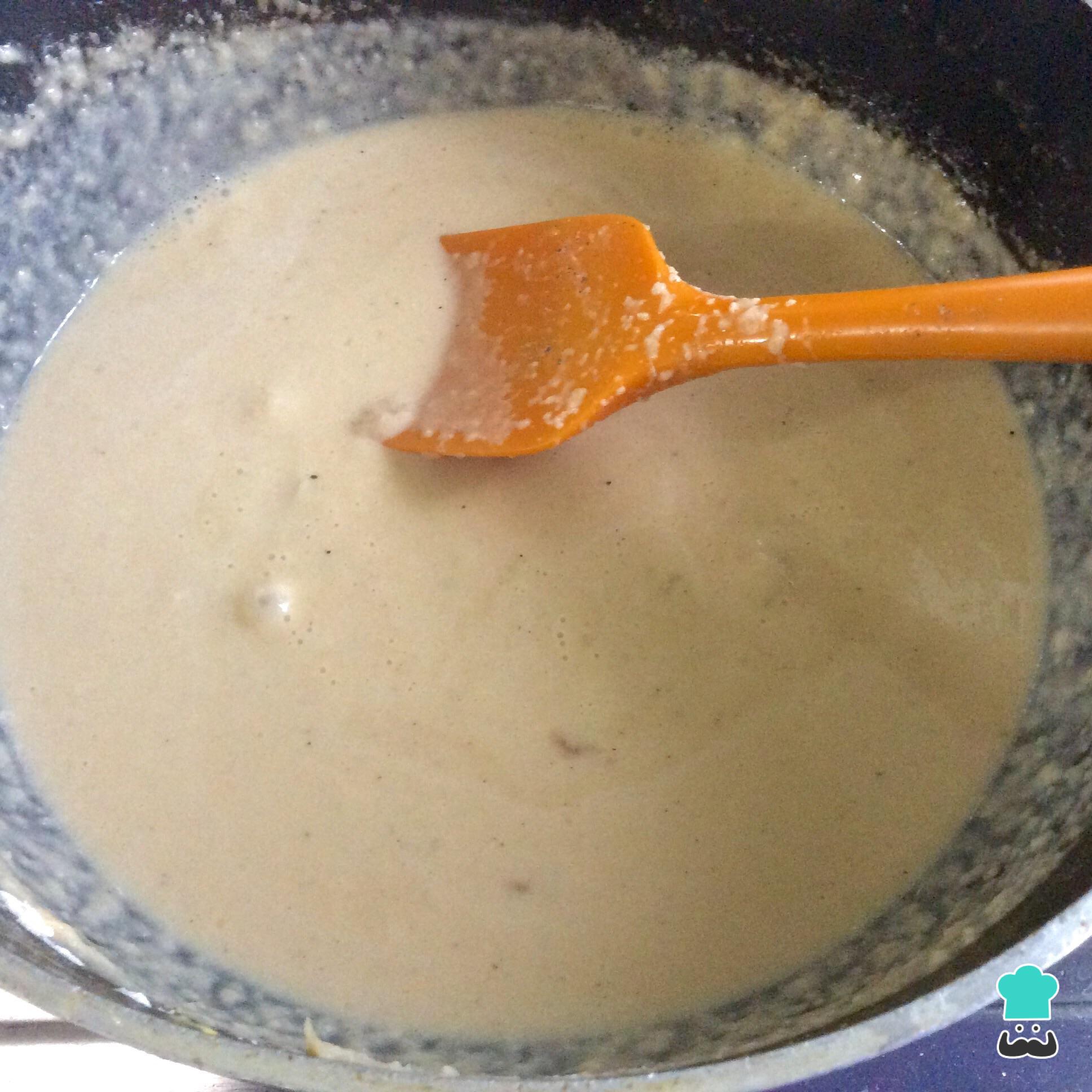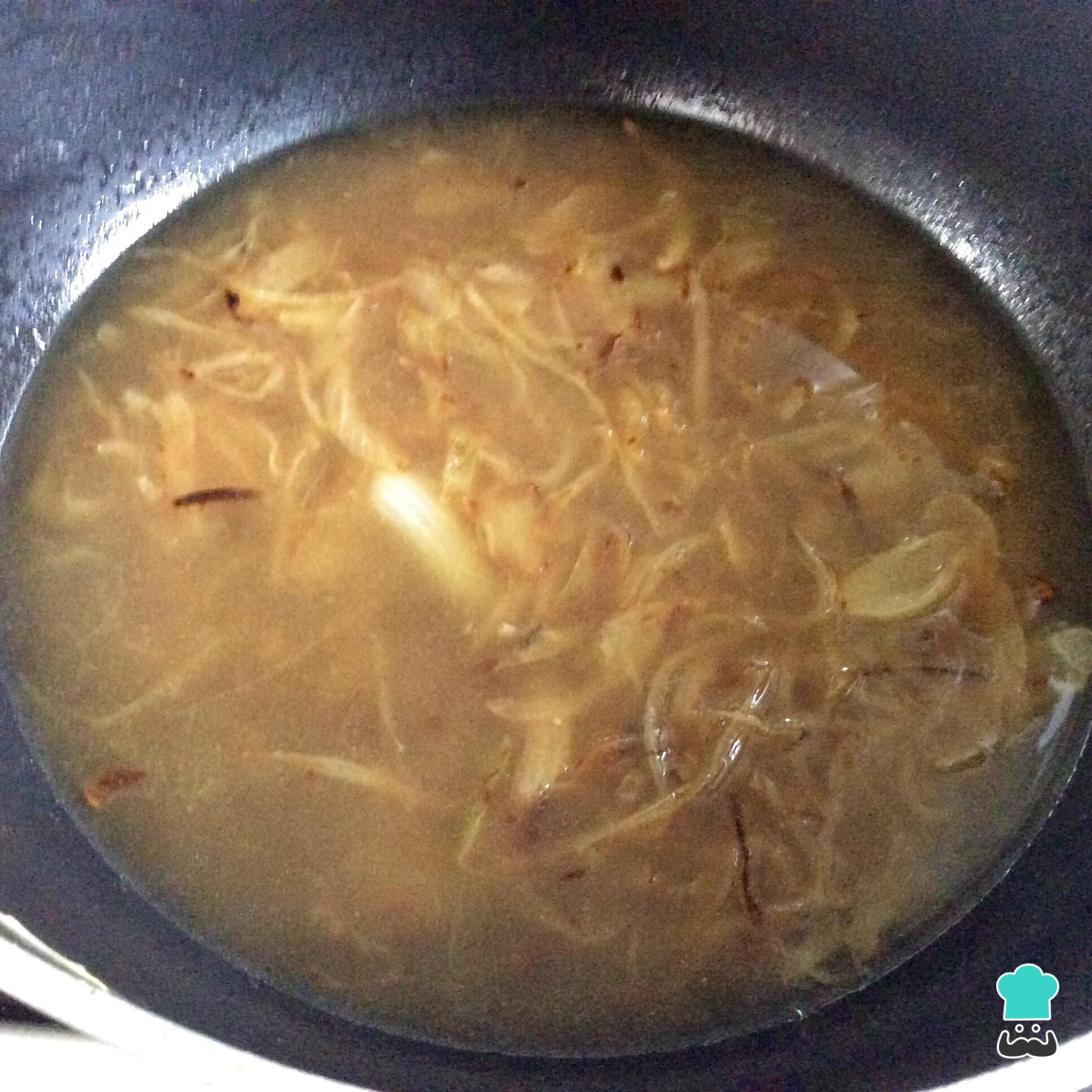 Assim que a cebola estiver bem dourada, o passo seguinte deste creme de cebola caramelizada é adicionar o caldo de galinha e temperar com sal e pimenta. Cozinhe por 5 minutos.