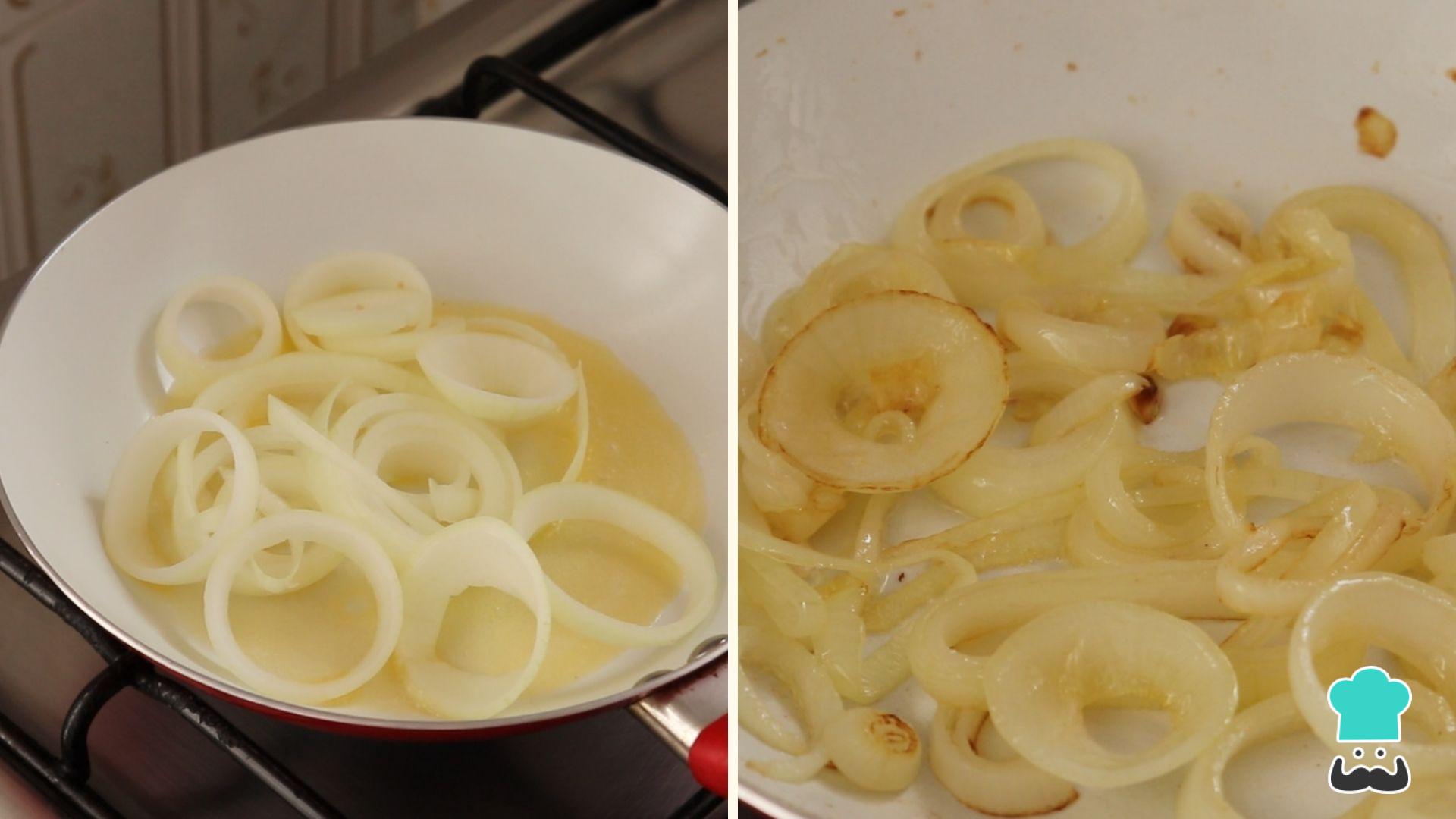 Leve uma panela ao fogo baixo e derreta a manteiga. Adicione a cebola e mexa de vez em quando até dourar.