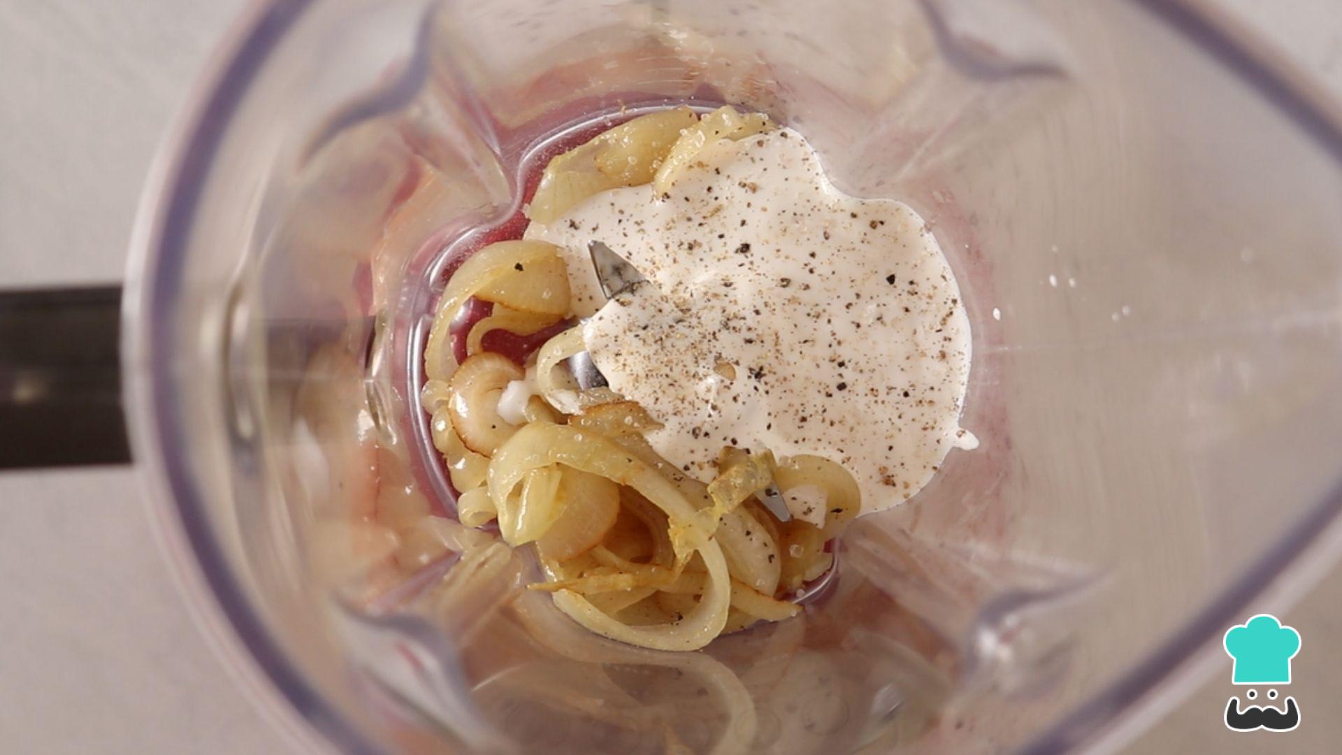 Agora coloque a cebola no liquidificador com o creme de leite e tempere com sal e pimenta a gosto. Bata até ficar na textura que você deseja: mais rústica ou mais lisa.