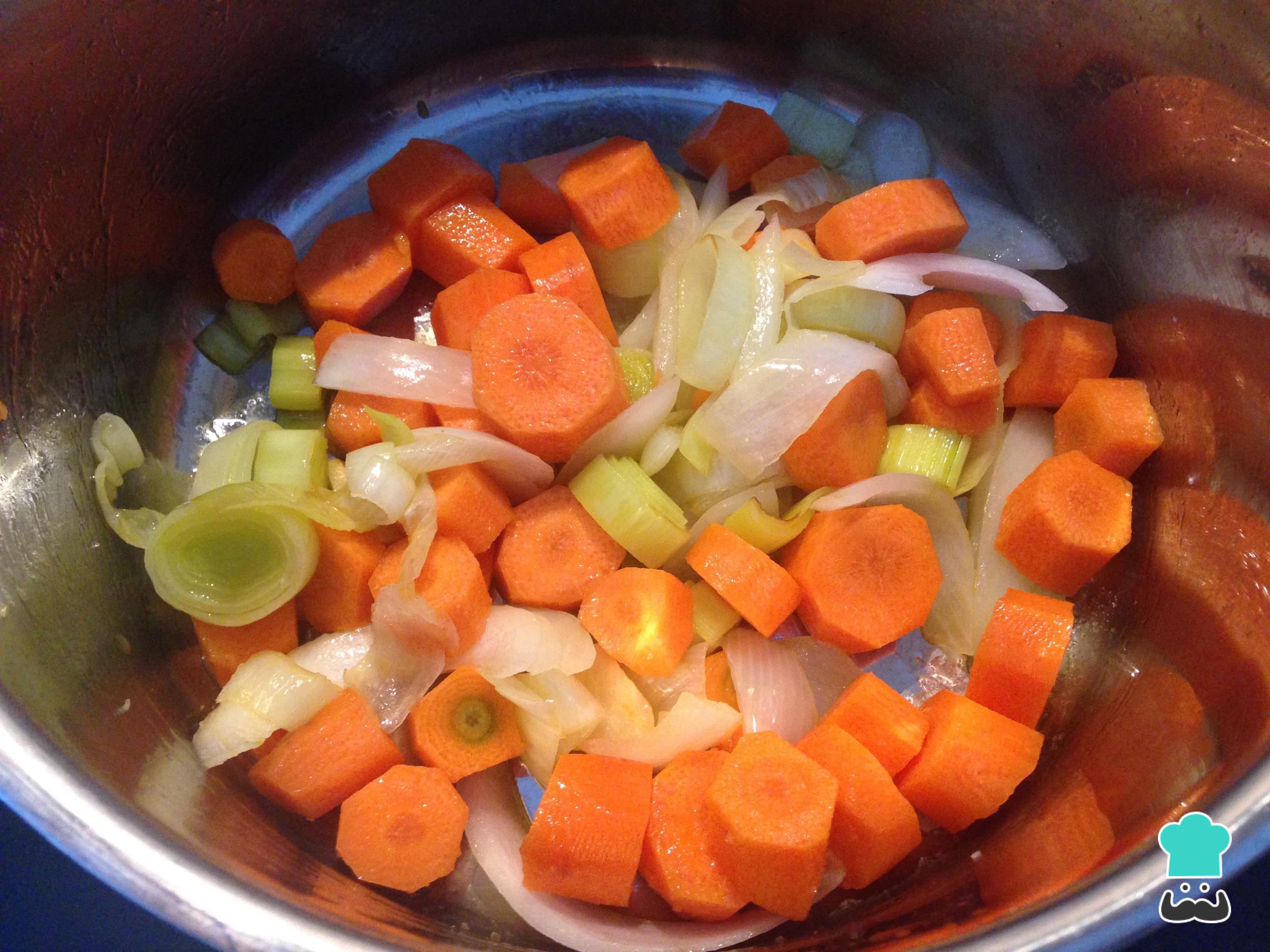 Descasque os legumes, corte em pedaços e refogue em uma panela com o azeite de oliva, por 5 minutos.