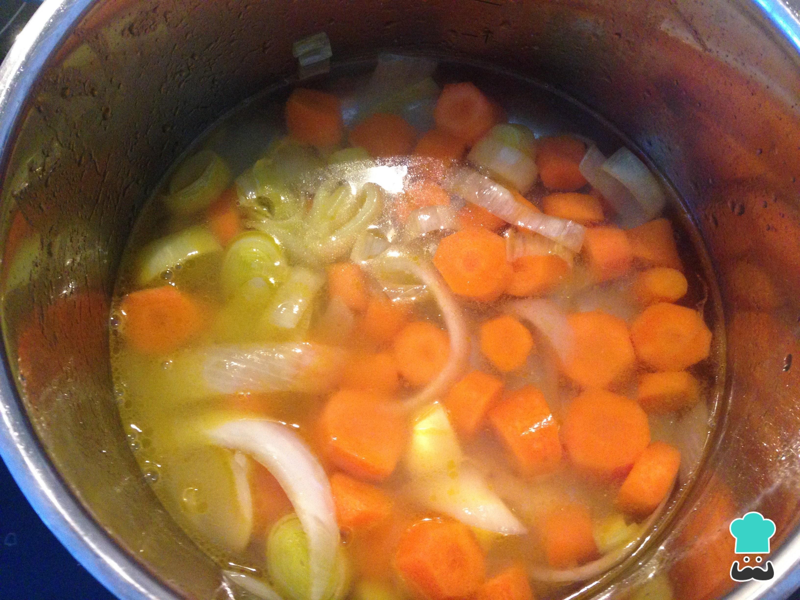 Depois acrescente o gengibre e água até cobrir. Tempere com sal e cozinhe até que as cenouras fiquem macias.