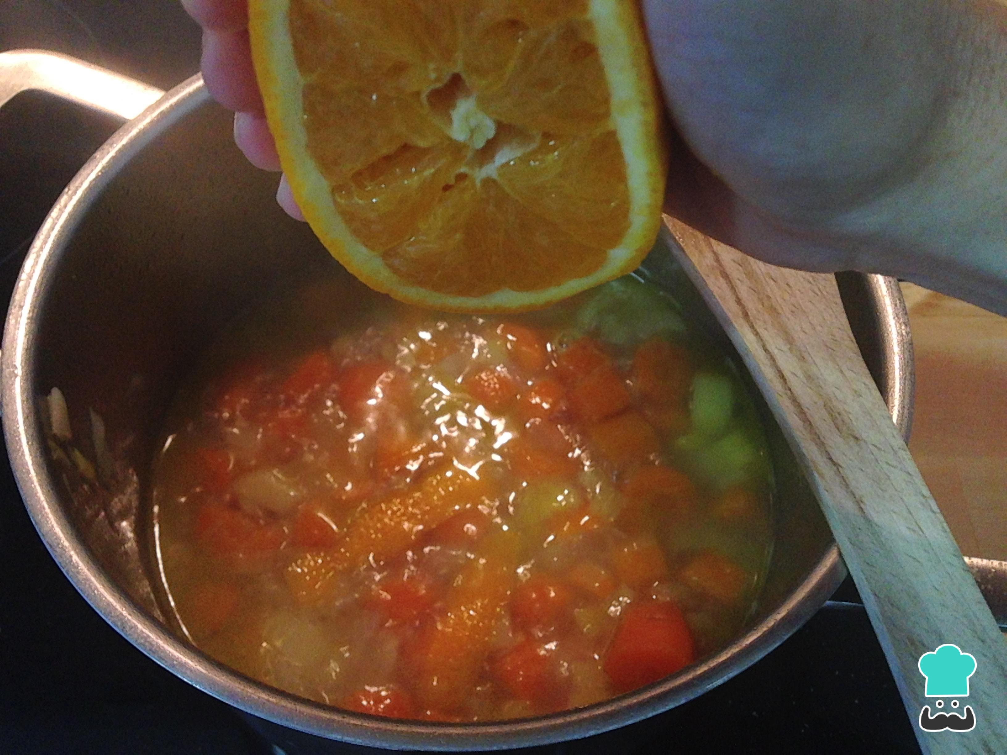 Quando as cenouras estiverem macias, acrescente o suco de uma metade de laranja e um pouco da pele da mesma (sem a parte branca). Deixe cozinhar este creme light por mais 5 minutos.