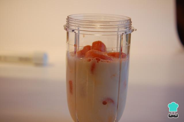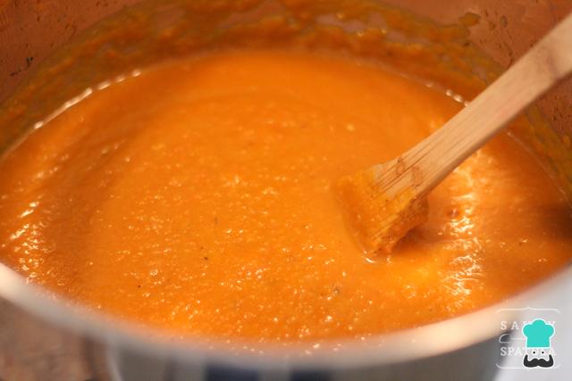 Esfrie a panela com água fria, retire as cenouras e coloque no liquidificador junto com o leite, sal e pimenta. Como alternativa pode colocar estes ingredientes diretamente na panela, e bater com o mixer.