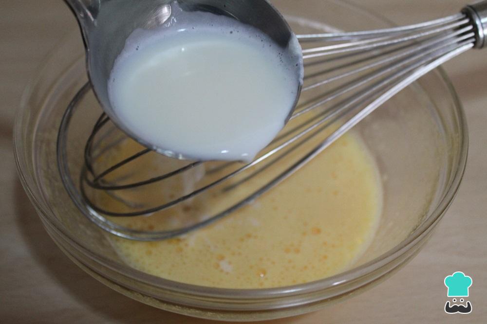 Quando o leite estiver fervendo retire-o do fogo. Coloque 1 concha desse leite na mistura de gemas e açúcar enquanto bate. Adicione o restante leite nessa tigela, continuando a bater para incorporar bem e evitar que as gemas fiquem coaguladas.