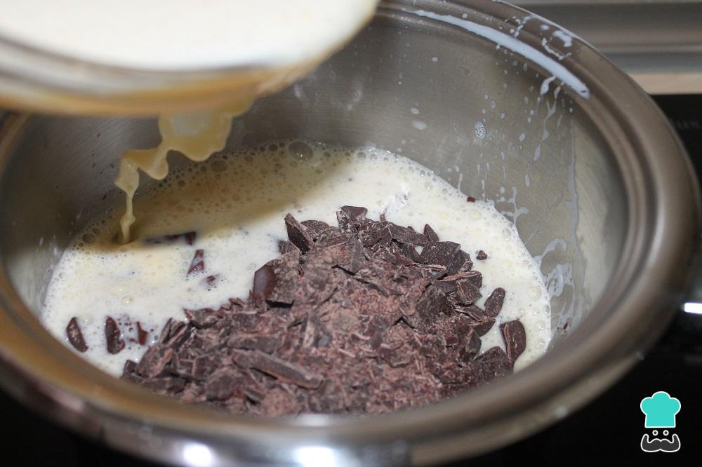 Na panela onde ferveu o leite coloque essa mistura de leite, ovos e açúcar e também o chocolate picado. Misture e leve ao fogo baixo, mexendo sempre, até o chocolate derreter.