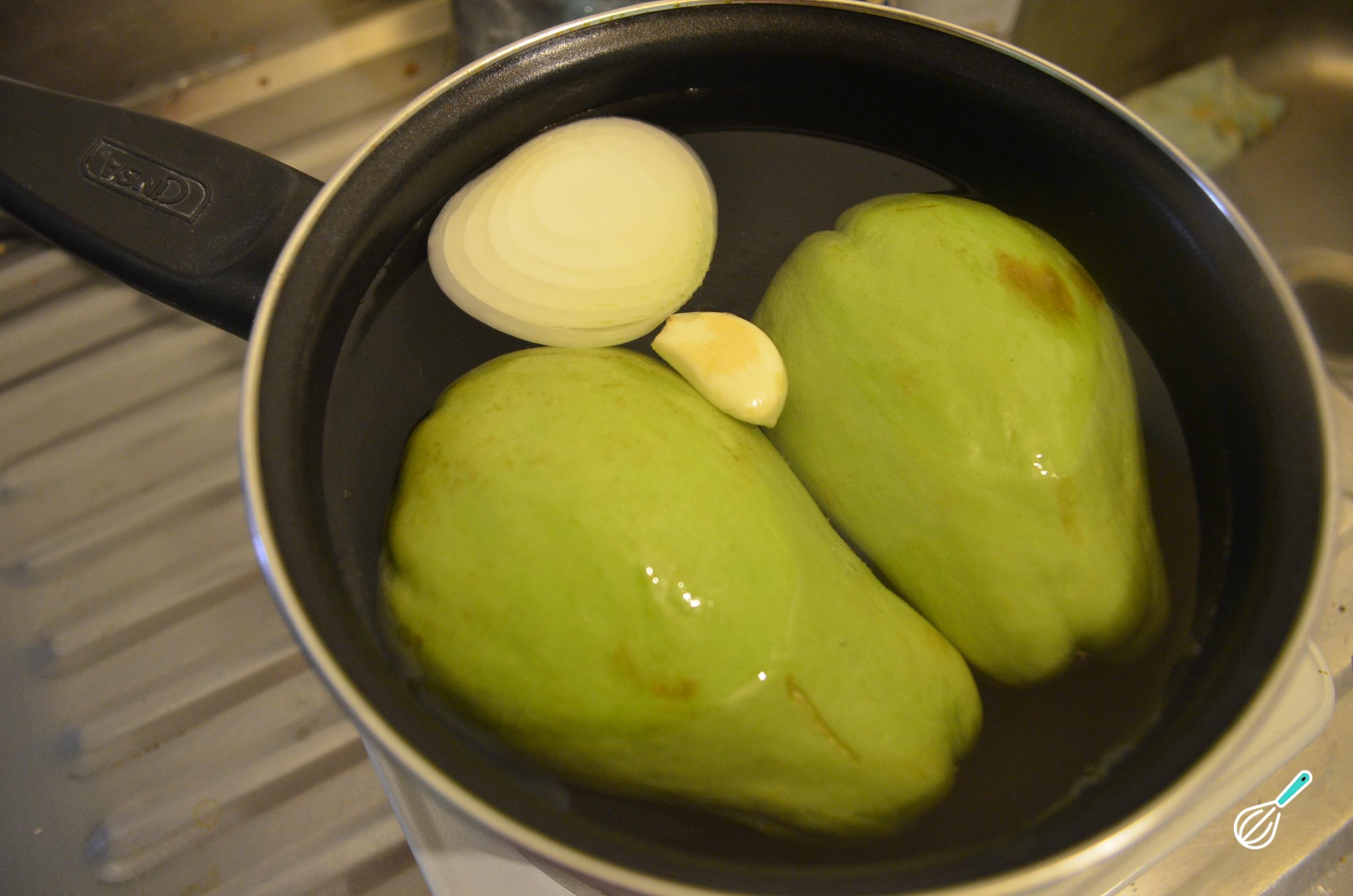 Para fazer creme de chuchu light, comece por lavar e cozer o chuchu inteiro, juntamente com o alho e a cebola. Coza em fogo médio por 20 minutos ou até que ficarem macios, você deve ser capaz de espetar um palito ou a ponta de uma faca facilmente.