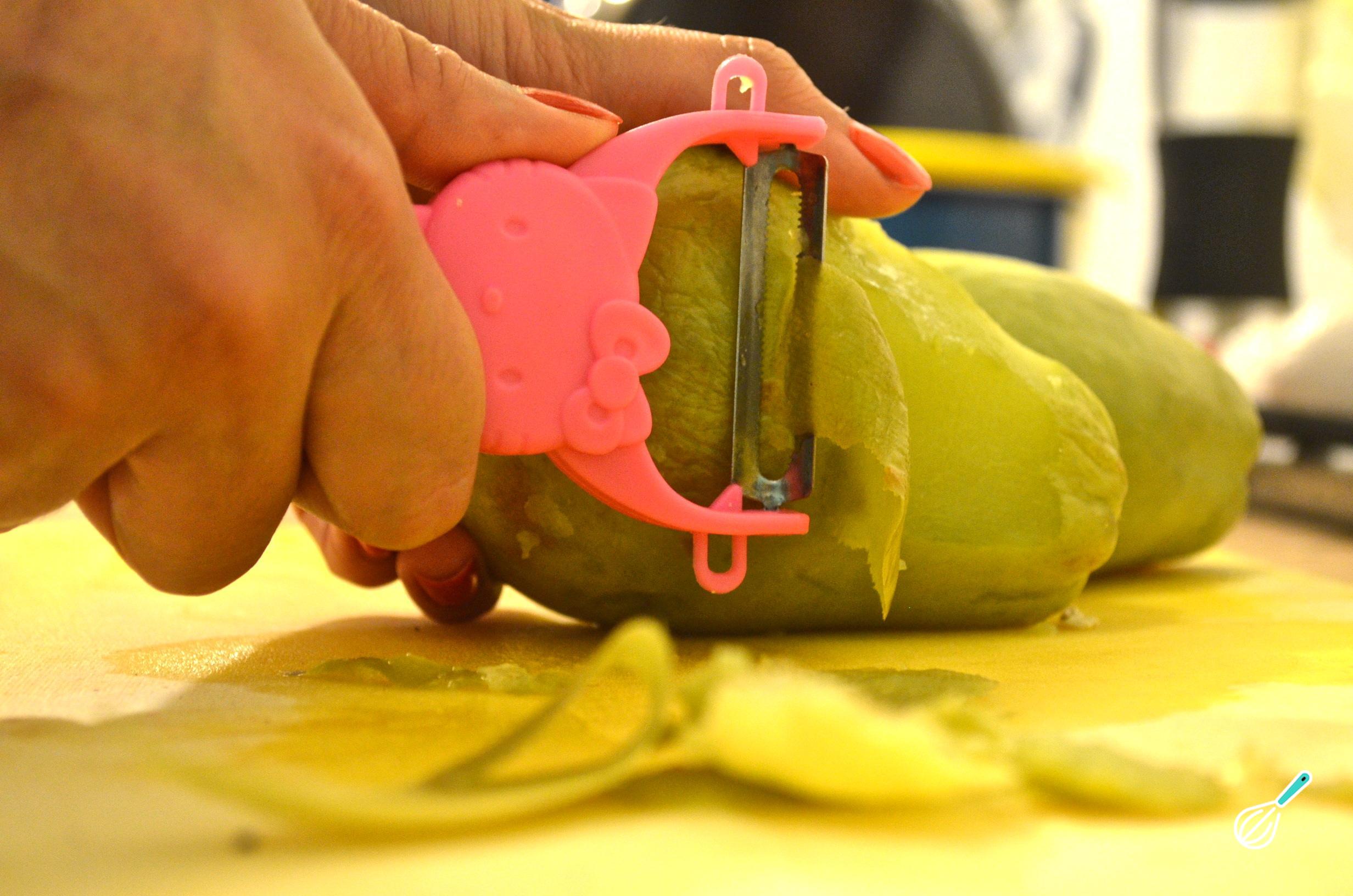 Uma vez cozidos, remova os chuchus da água e descasque. Pode fazê-lo com um descascador de legumes ou com faca. É mais prático com descascador e, assim, só tira a casca sem remover também a polpa.