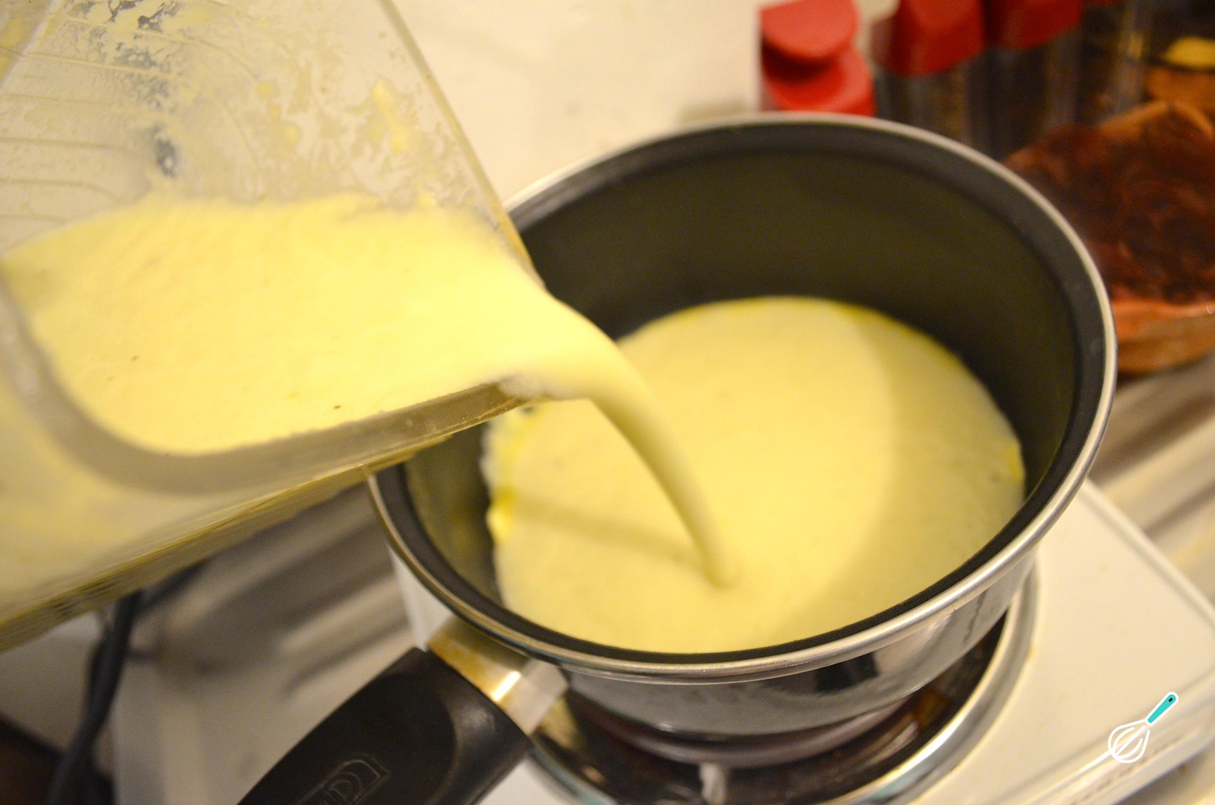 Batata o chuchu com o caldo de frango, o leite, o alho e a cebola no liquidificador até obter uma mistura suave. Aqueça em uma panela antes de servir.