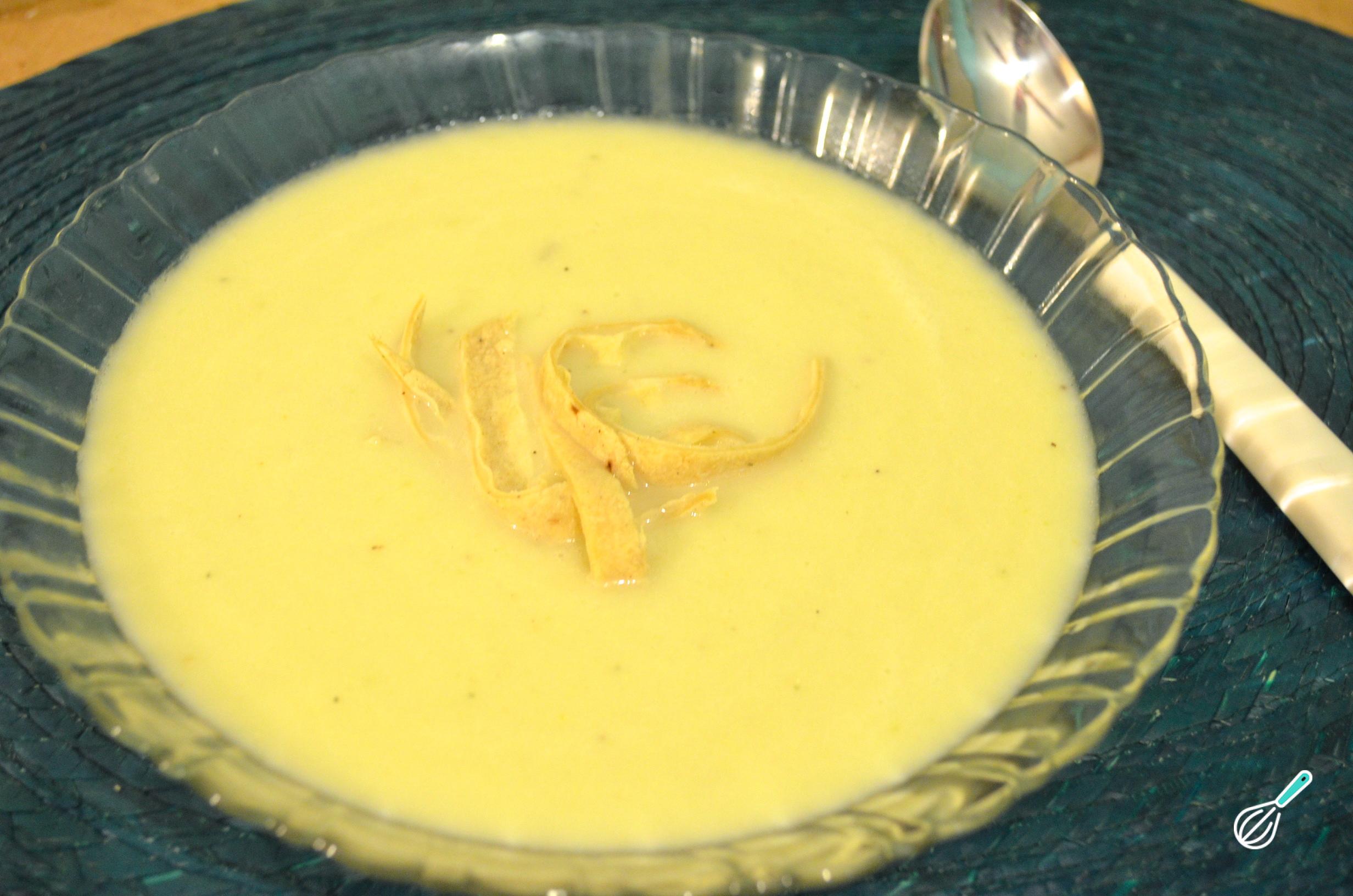 Decore o creme da luz de chuchu tortilhas de milho cortadas em tiras e sirva quente.