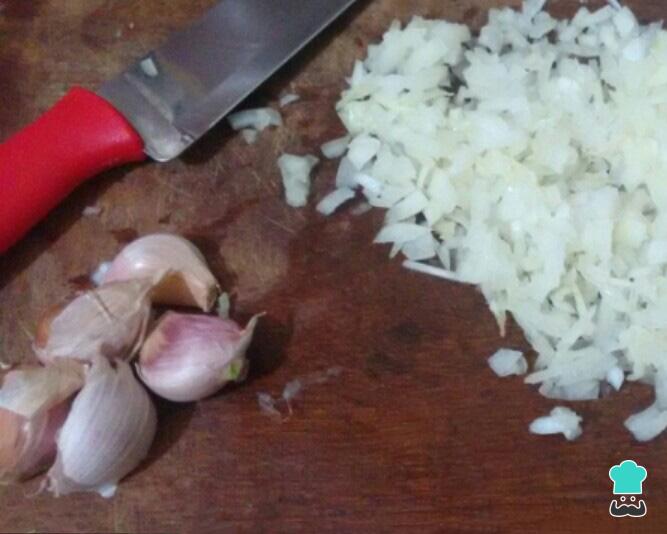 Em seguida pique a cebola, retire o miolo do alho e amasse-os.