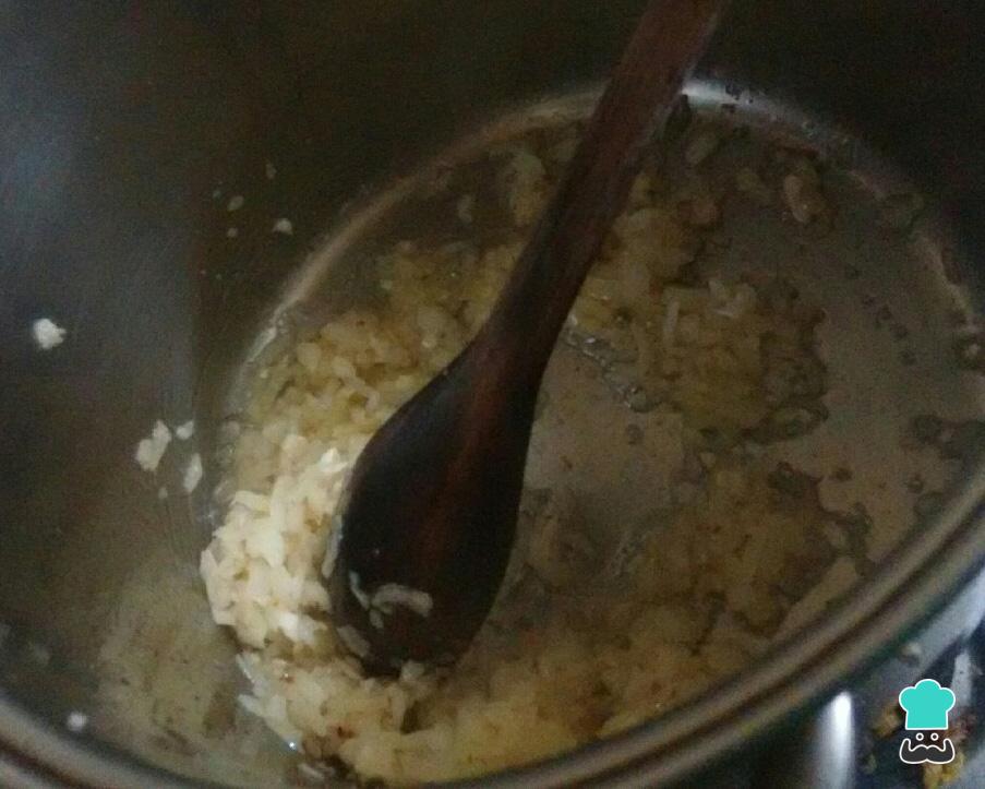 Na gordura apurada do bacon coloque a cebola e o alho e refogue até a cebola ficar translúcida. Assim você consegue que o creme de ervilha em lata com bacon fique mais saboroso.