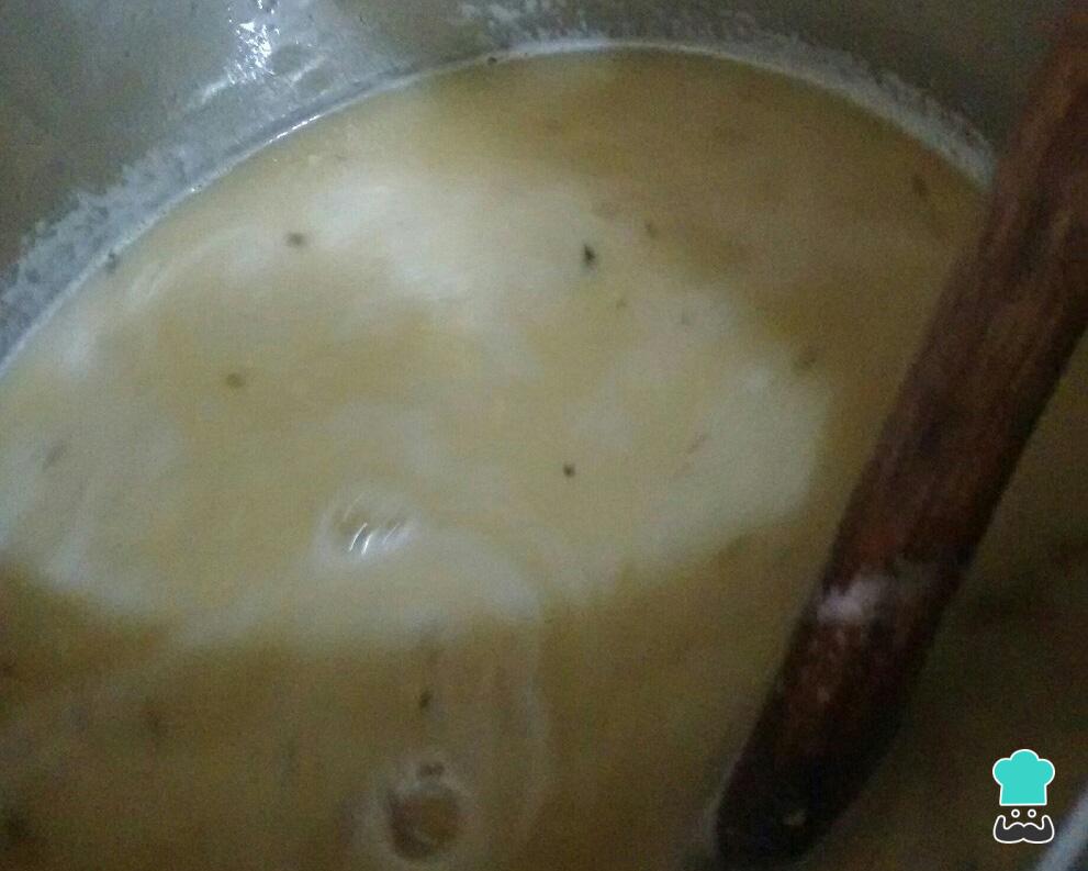 Acrescente as ervilhas batidas ao refogado e mexa bem até ferver. Em seguida acrescente o amido de milho dissolvido no litro de água e continue mexendo até ferver novamente.