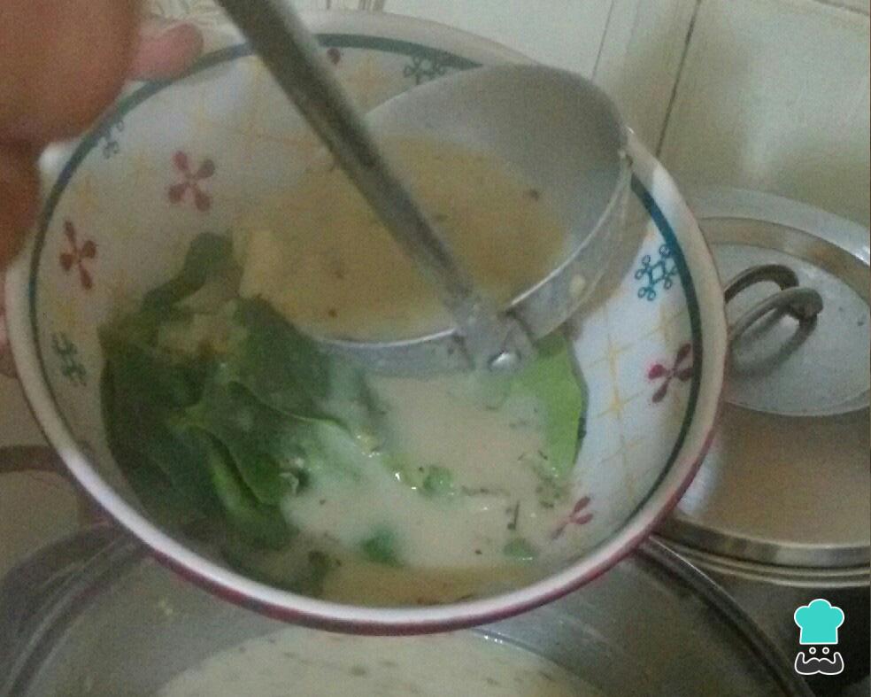 Quando o creme ferver está pronto a servir! Coloque algumas folhas de espinafre no fundo do recipiente que for servir o caldo e deixe ficar um pouco para que elas murchem.