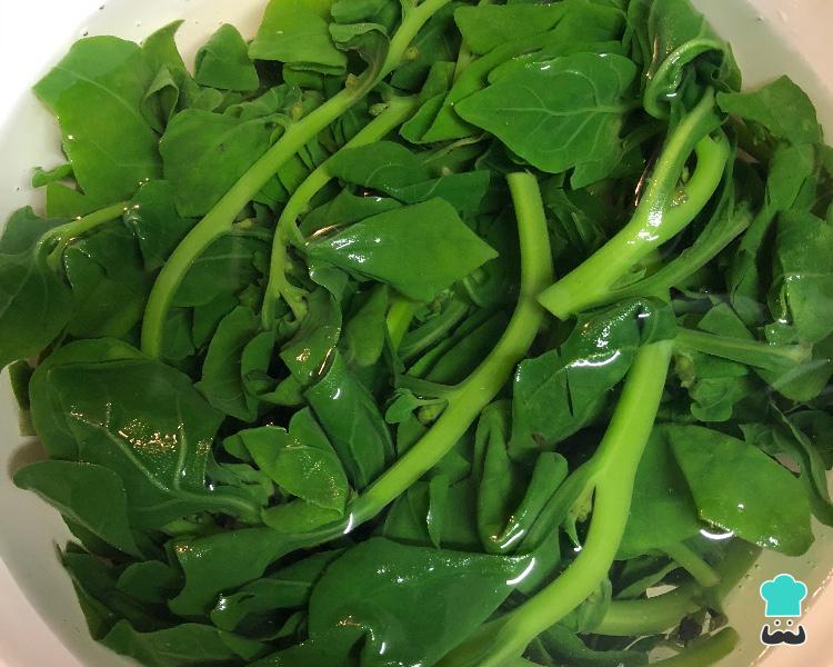 Comece a receita do creme de espinafre escaldando o espinafre em água fervente. Deixe o espinafre na água fervente por 2 minutos.