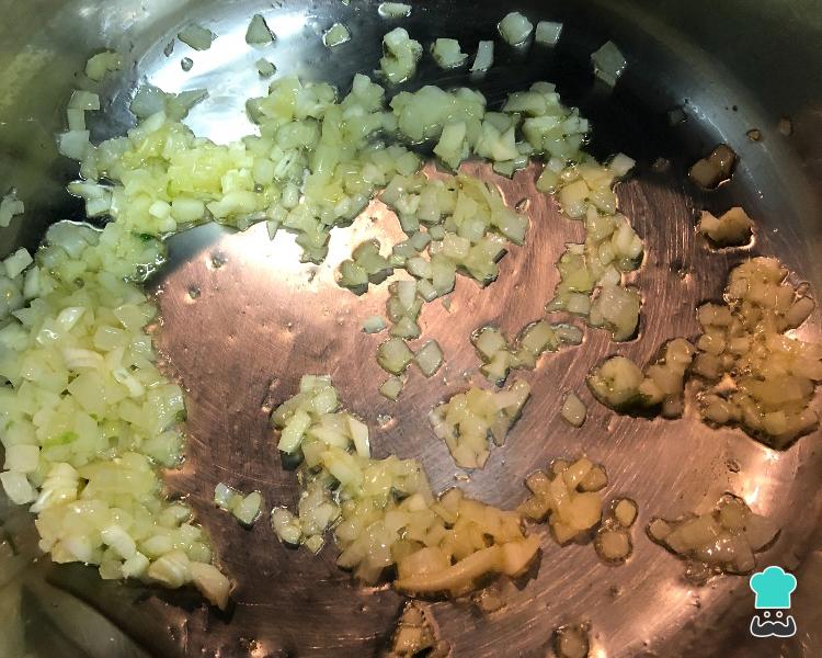 Para continuar preparando esta receita de creme de espinafre com queijo em uma panela refogue a cebola no azeite até murchar.
