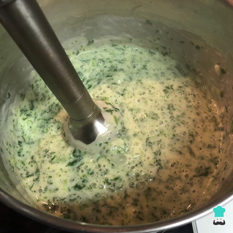 Com um mixer manual bata um pouco o creme, mas ainda mantendo alguns pedaços de espinafre.