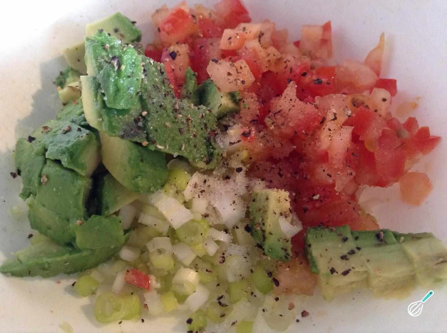 E seguida prepare um picadilho que acompanhará a sopa de feijão e a tornará ainda mais saborosa! Para isso, numa tigela coloque o alho-poró eo tomate finamente picados, junto com o abacate cortado em cubos. Tempere com sal, pimenta do reino e um pouco de pasta de alho a gosto.