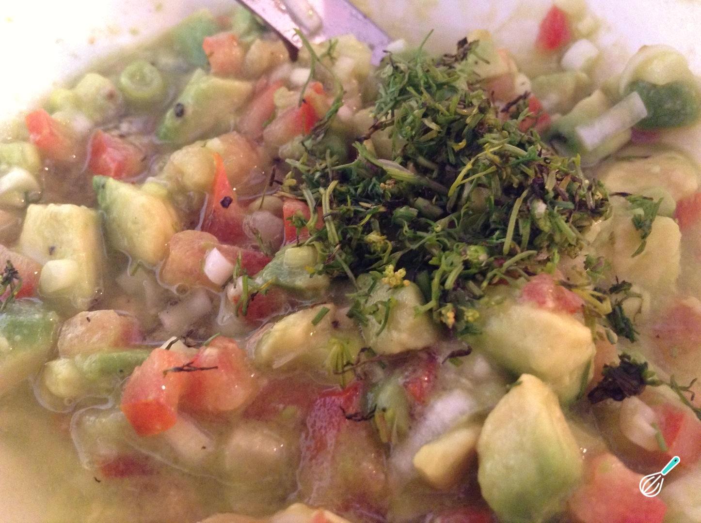 Acrescente o coentro picado e misture bem todos estes ingredientes do picadilho. Se você quiser, pode ainda adicionar um pouco suco de limão ou vinagre, para que o abacate não oxide. Reserve.