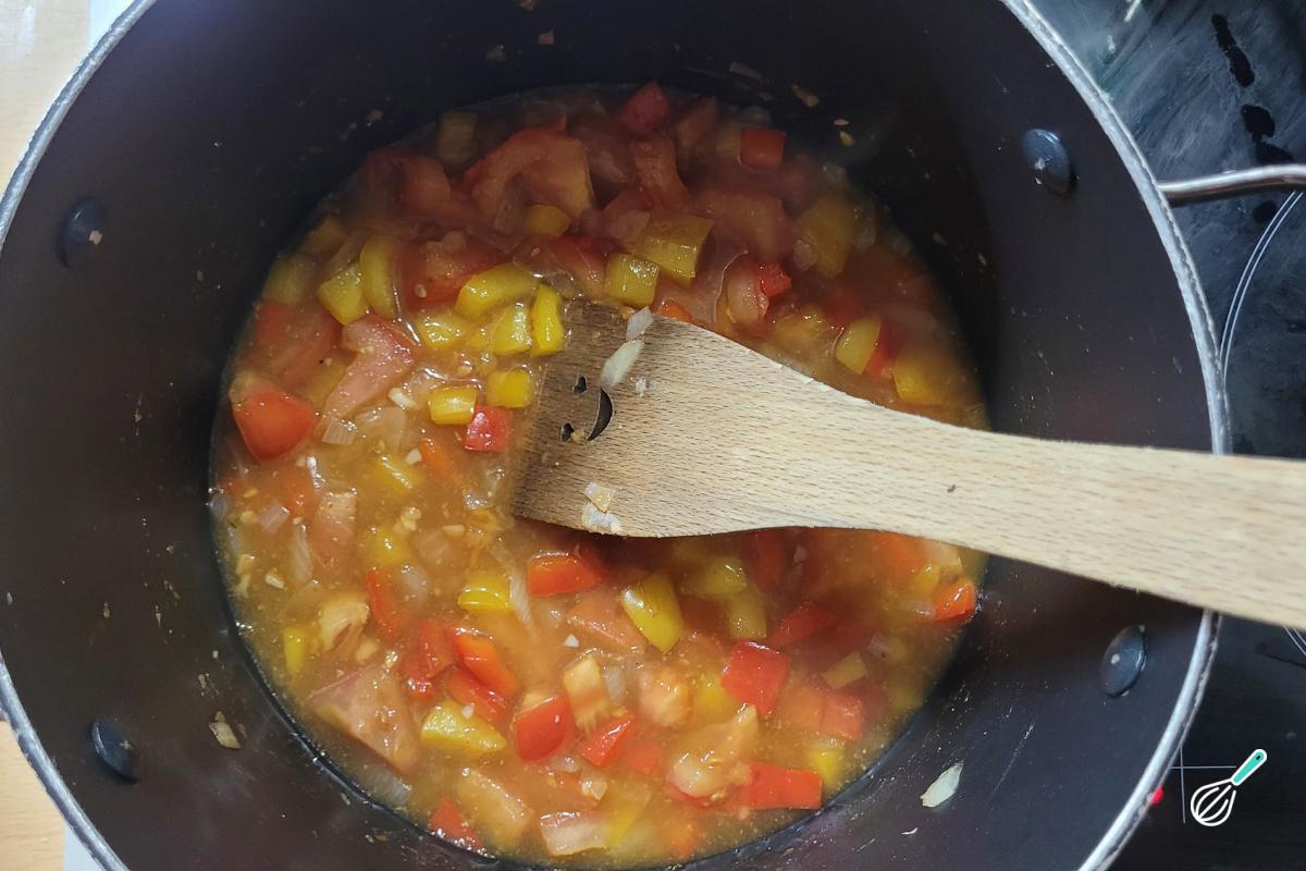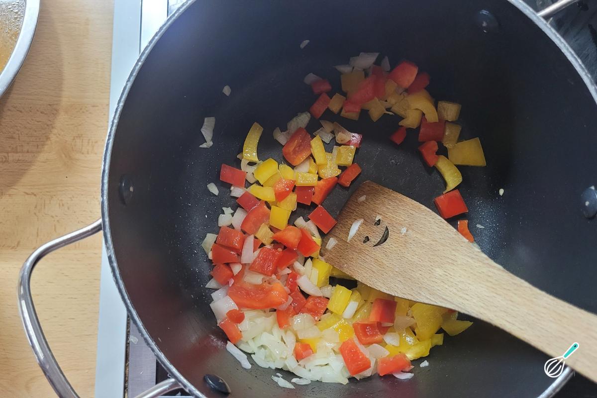 Quando dourar, adicione os pimentões e deixe dourarem um pouco. Depois adicione o tomate e deixe que comecem a soltar a água formando quase uma pastinha.