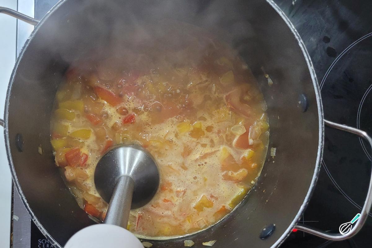 Adicione creme de leite e bata com um mixer de mão até ter um creme liso. Se não tiver um mixer de mão, basta transferir a mistura para o liquidificador e depois voltar com ela para a panela.