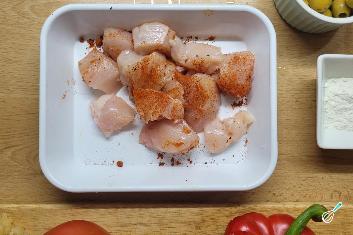Depois de cortar, tempere com sal, pimenta do reino e gosto também de usar páprica, mas pode usar os temperos que preferir.