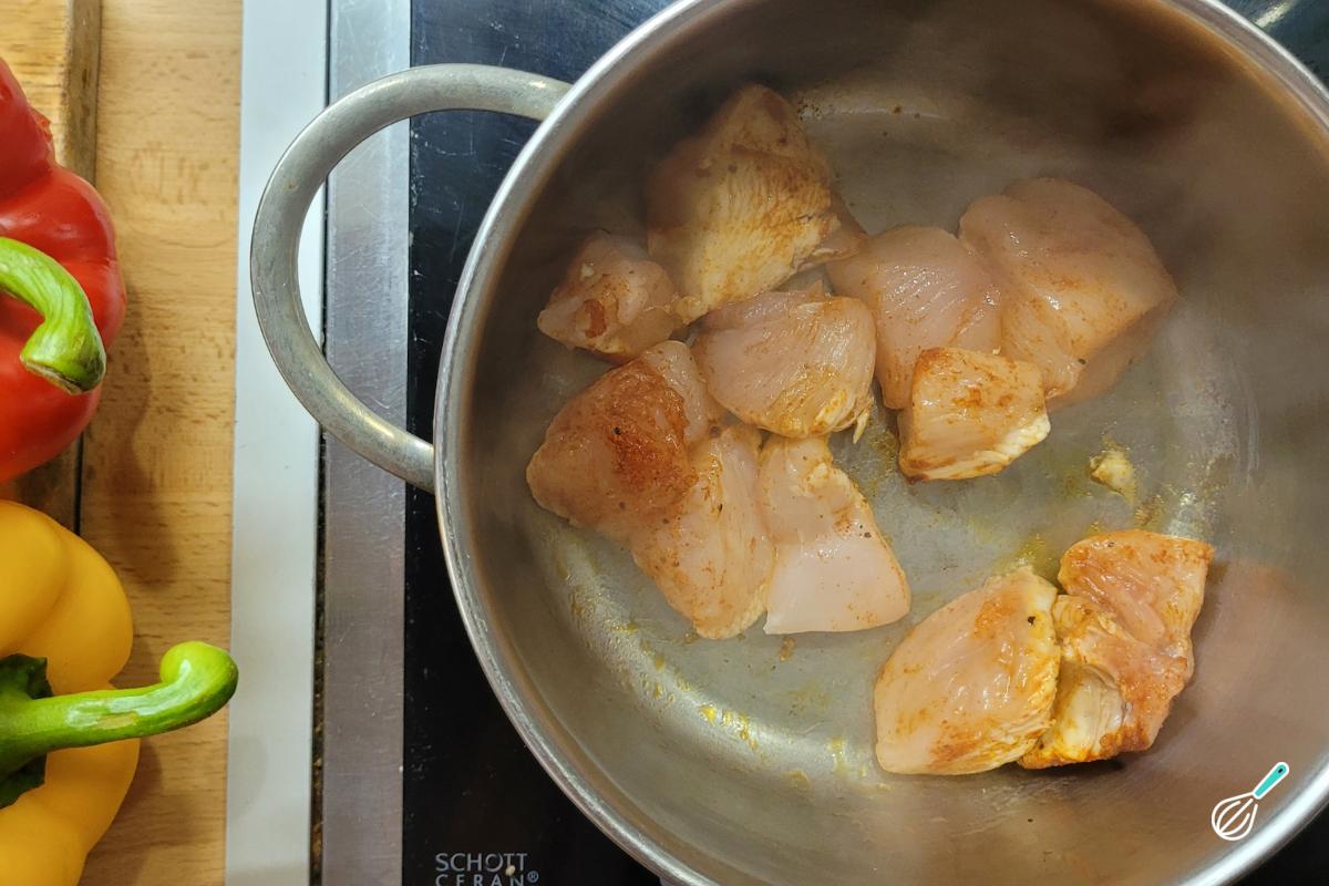 Em uma panela, coloque um fio de azeite e quando esquentar, coloque os cubos de frango para dourar. Isso traz mais sabor tanto para o frango quanto para o caldo.