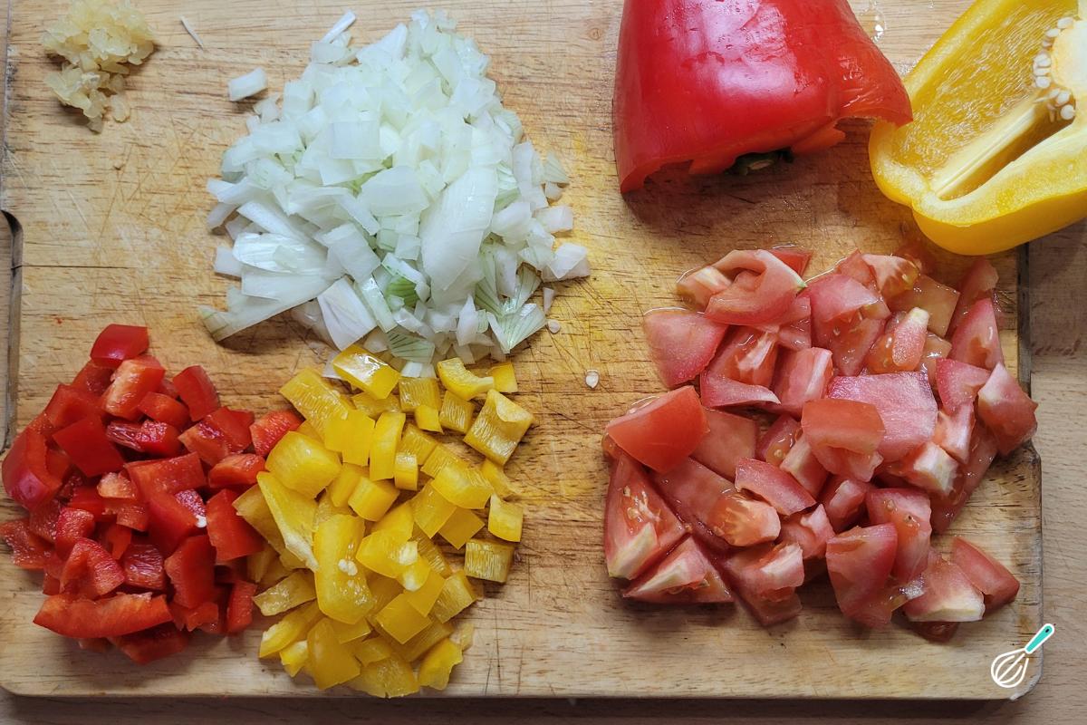 Enquanto o frango cozinha, aproveite para cortar a cebola, o alho, o tomate e os pimentões para já deixar tudo pronto para depois.